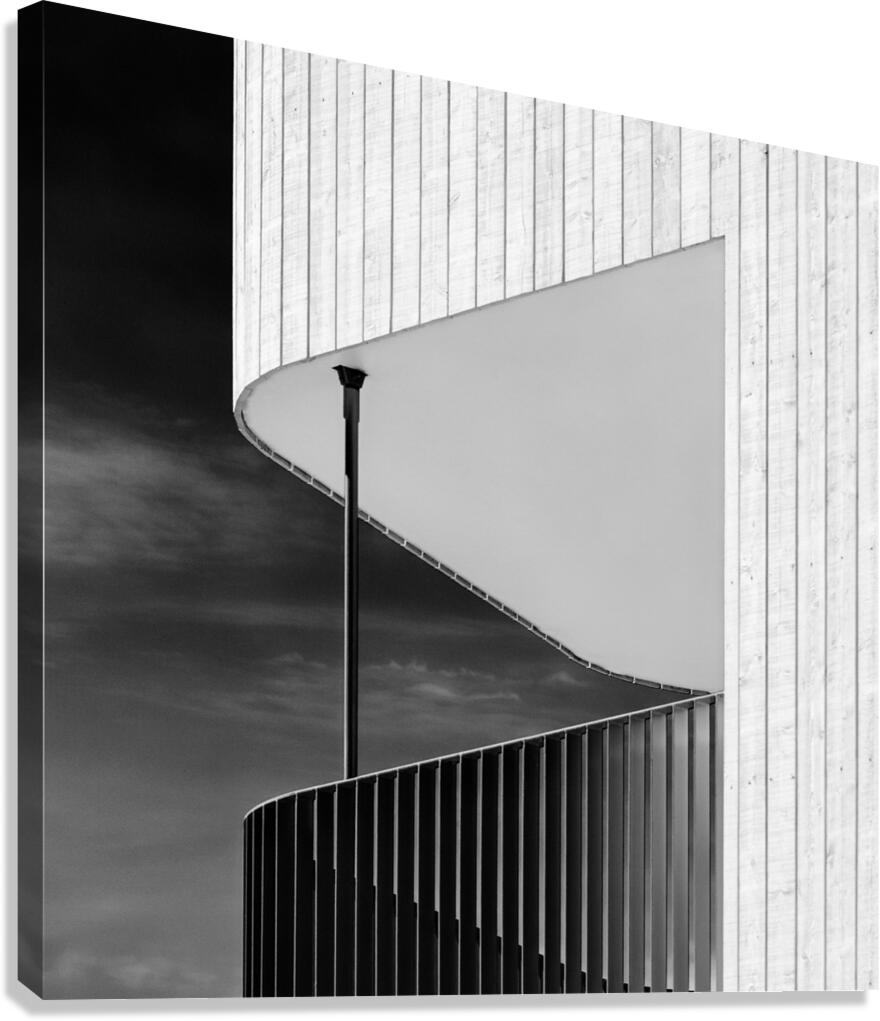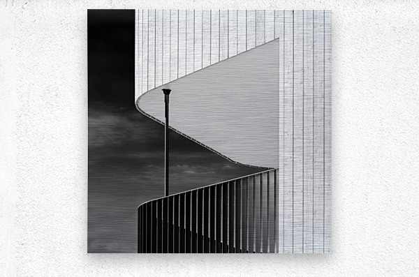 A semi-abstract study of a curved balcony on a modern Dutch building in Almere Netherlands. The smooth metal railing arcs gracefully against a backdrop of white wooden slats creating a quiet contrast in texture and tone. A great photograph for those who appreciate architectural detail clean lines and the subtle beauty of minimalist design.