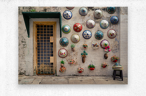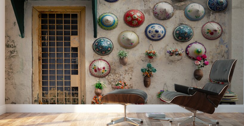 Colourful conical hats arranged on a rustic weathered wall in the backstreets of Ipoh Malaysia creating a lively mix of tradition and charm. Brightly painted flowers in hanging pots add to the vibrant display bringing warmth and character to the textured setting. A great photograph for those who appreciate everyday street scenes full of culture colour and personality.