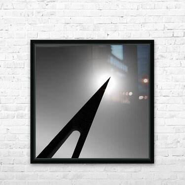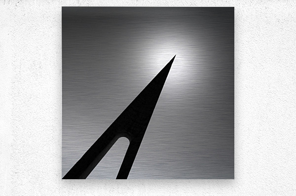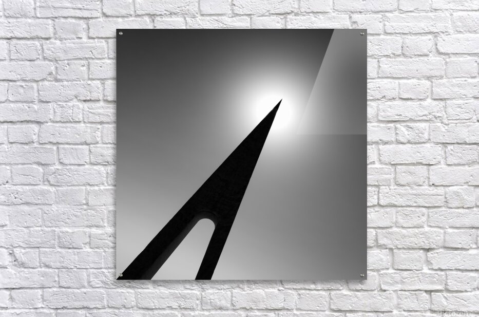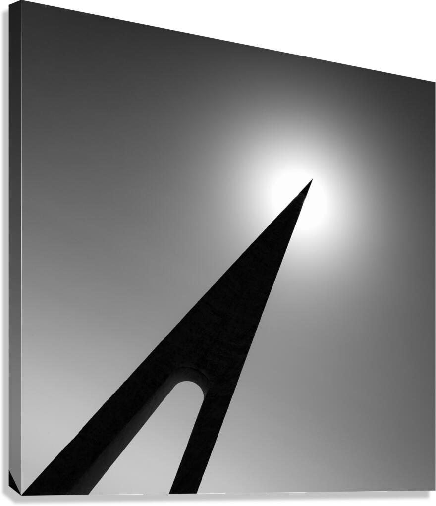 A semi-abstract image of the midday sun caught behind the sharp tip of the Nungesser and Coli aviation monument in Étretat France. The stark contrast between the monument’s silhouette and the bright sky creates a bold graphic composition with a sense of stillness and precision. A great photograph for admirers of architectural form minimalist design and striking modern memorials