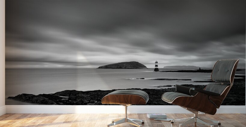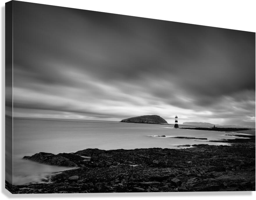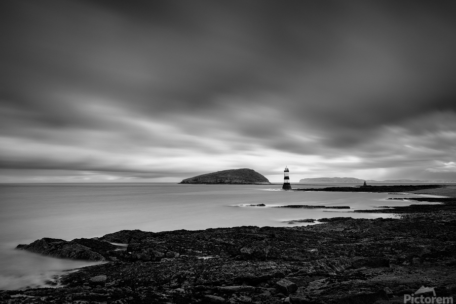 Penmon Lighthouse stands in the distance along the rugged coastline of Anglesey, North Wales. Known locally as Trwyn Du Lighthouse, it rises quietly at the edge of land and sea. A long exposure smooths the movement of water and clouds, giving the scene a calm, almost dreamlike quality. A great photograph for those drawn to remote coastlines and the quiet strength of coastal landmarks.