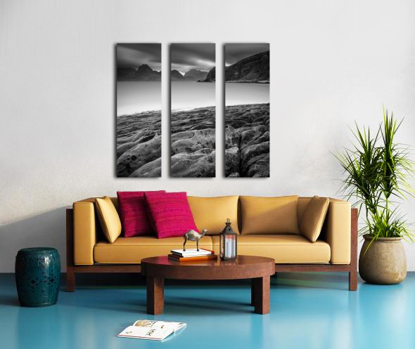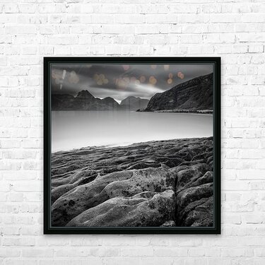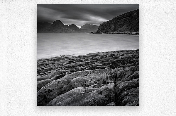 The Cuillin mountains seen from the shoreline at Elgol on the Isle of Skye where smooth wave-shaped rocks lead the eye toward the distant rugged peaks. A long exposure softens the surface of the sea and draws streaks across the heavy clouds above adding a sense of quiet drama to the scene. A perfect photograph for those who feel a connection to Scotland’s wild untamed beauty.