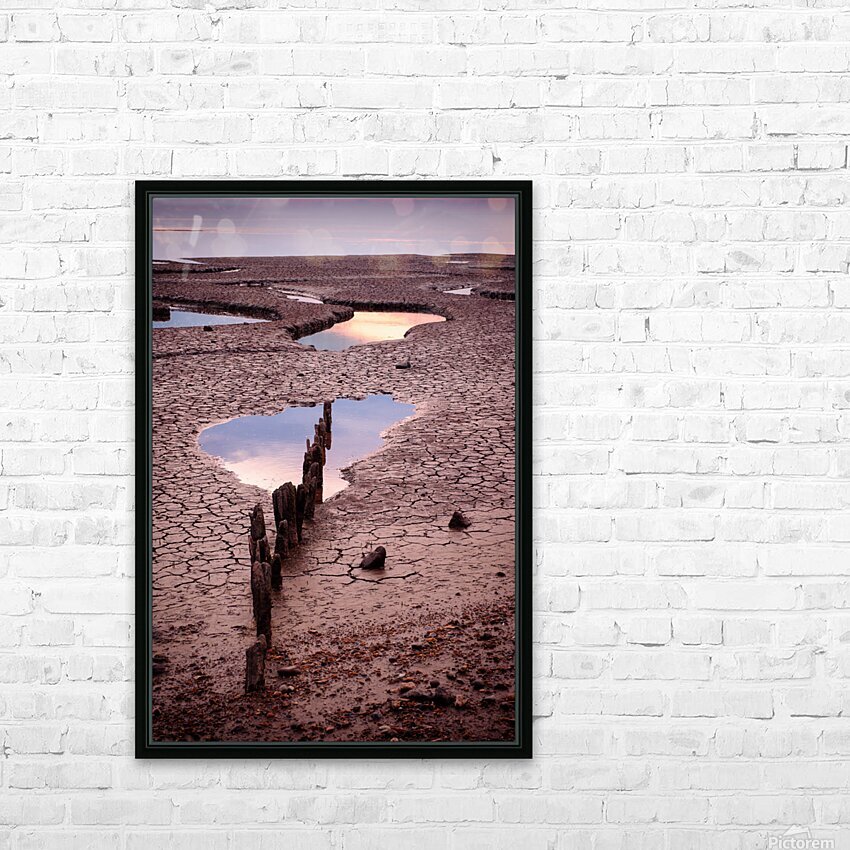 A low tide sunset view of the salt marsh flats at Snettisham in Norfolk where cracked mud and the decaying wooden struts of old sea groynes tell a quiet story of time and tide. Small tidal pools catch the fading light reflecting the final glow of the day across the textured landscape. A perfect photograph for those who appreciate coastal solitude and the quiet beauty found in weathered timeworn places.