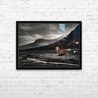 A small white cottage sits alone in the vastness of Glencoe framed by a winding stream in the foreground and rugged Highland mountains rising behind. The stripped-back tones bring out the isolation and quiet strength of the scene capturing the raw weather-beaten character of this remote corner of Scotland. A great photograph for those who feel a connection to wild landscapes and the solitude of the Highlands.