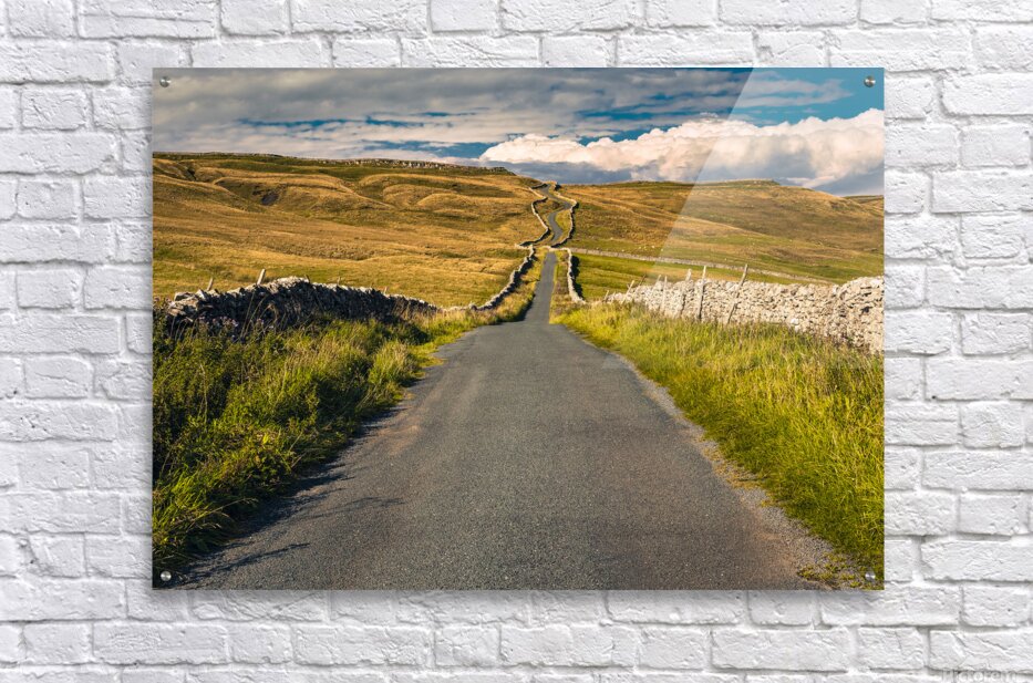A quiet road winds through the Yorkshire Dales on a bright sunny day flanked by rustic stone walls that guide the eye toward the horizon. The mix of blue sky and drifting cloud adds depth to the open landscape capturing the charm and simplicity of rural England. A perfect photograph for those who love peaceful countryside scenes and the timeless appeal of the Dales.