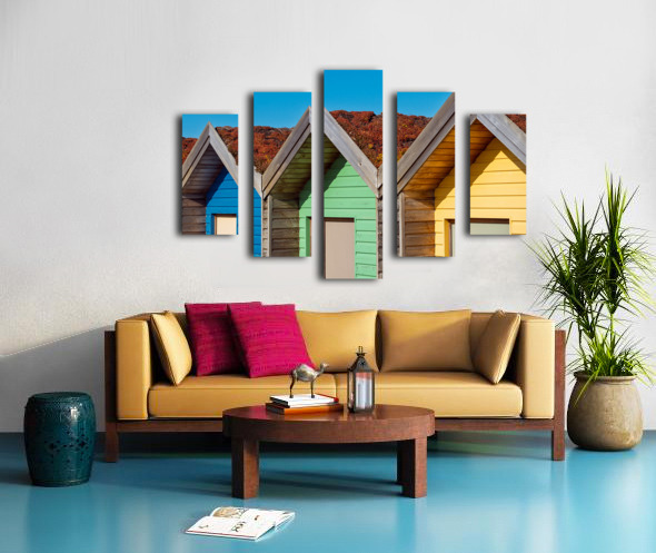 A semi-abstract view of the Blyth Beach Huts in Northumberland England captured on a bright sunny day. The vivid colours of the huts stand out against a clear blue sky with bold angles offering a fresh take on this quaint slice of traditional English seaside charm. A perfect photograph for those who appreciate classic coastal scenes with a colourful nostalgic feel.