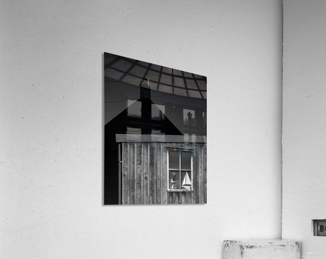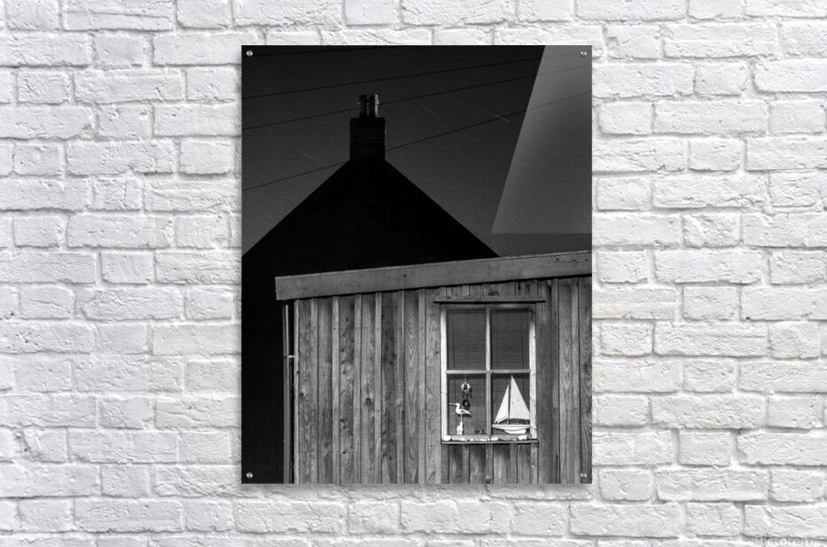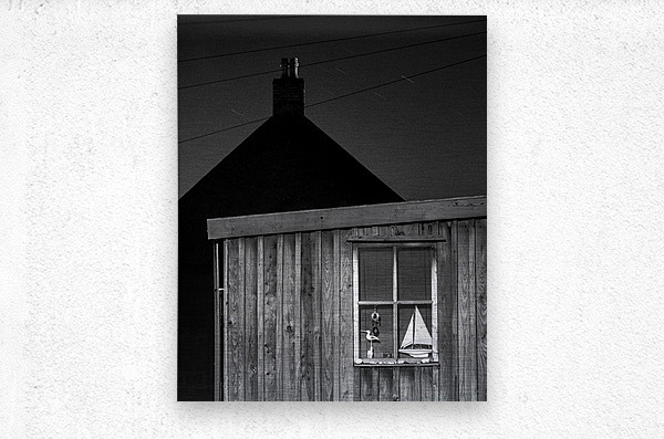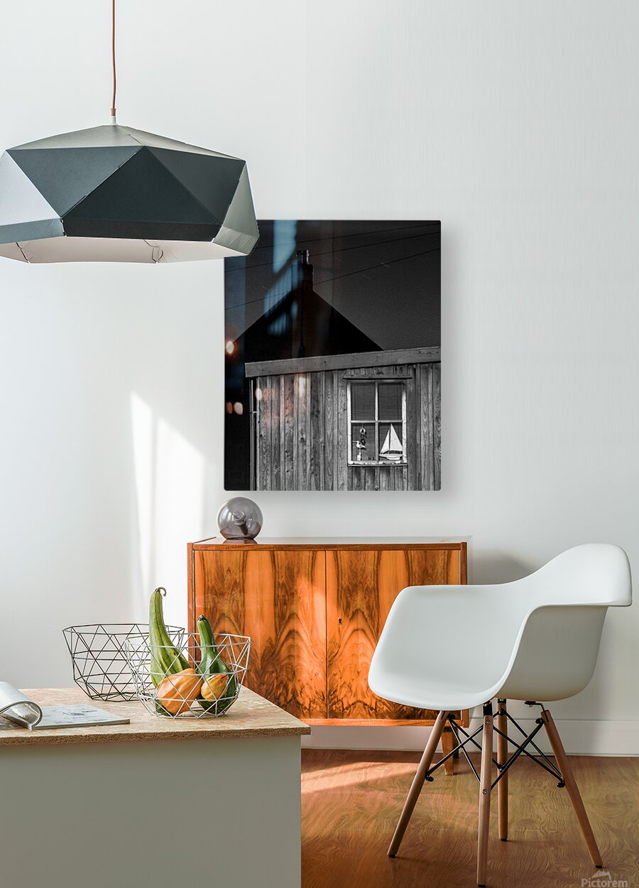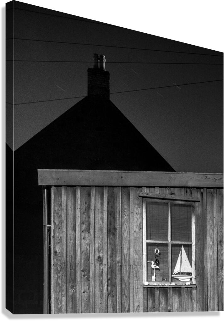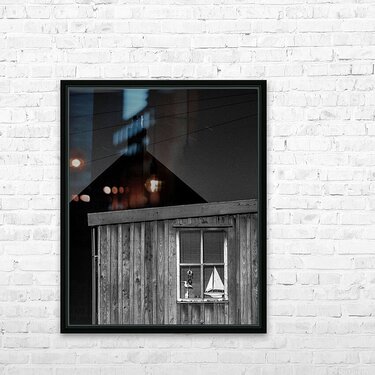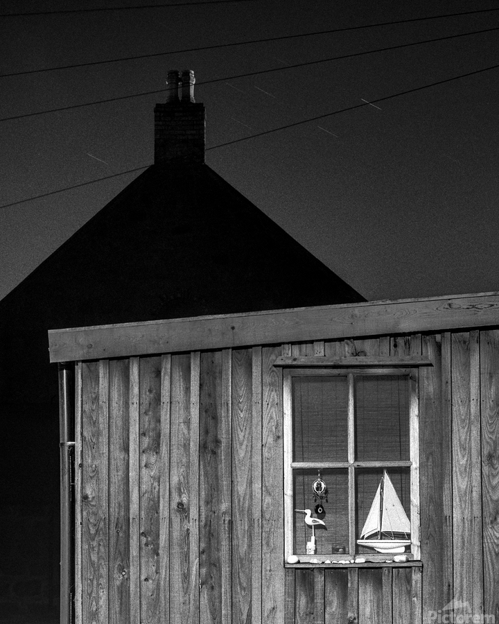 A quiet nighttime scene from Footdee the historic fishing village at the edge of Aberdeen harbour. One of the small wooden huts stands in soft shadow its window revealing a toy yacht resting inside. Behind it the silhouette of another building and chimney adds depth and a sense of enclosure. A great photograph for those who appreciate the charm of coastal communities and the quiet stories held in overlooked corners. ..... Please note: This image has a slightly grainy texture because it was photographed on analog film.