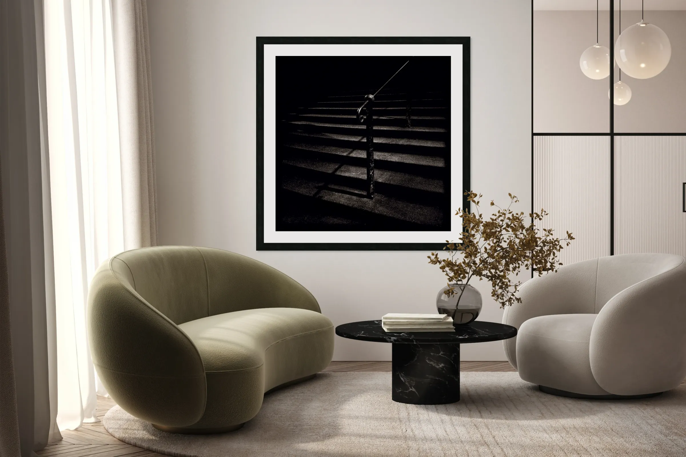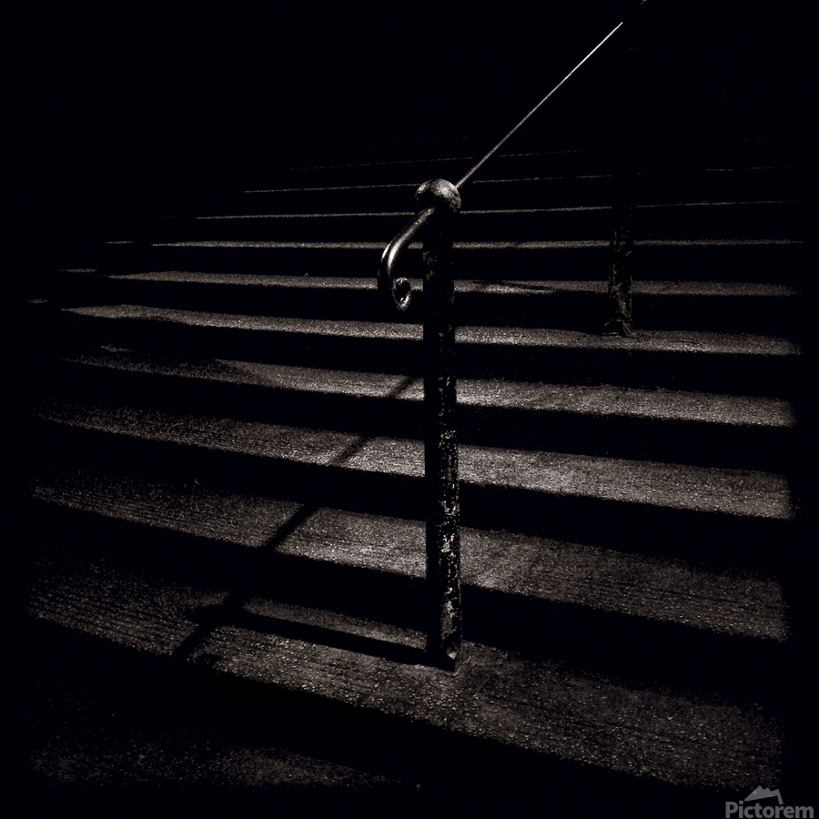 A minimalist view of the steps and metal handrail at the base of Advocates Close in Edinburgh captured in quiet tones and simple lines. The composition draws attention to the rhythm of the stonework and the gentle curve of the rail offering a moment of stillness in one of the citys most historic alleys. A great photograph for those who appreciate subtle urban detail and the atmosphere of old Edinburgh. ..... Please note: This image was deliberately captured lo-fi a choice that was made for aesthetics.