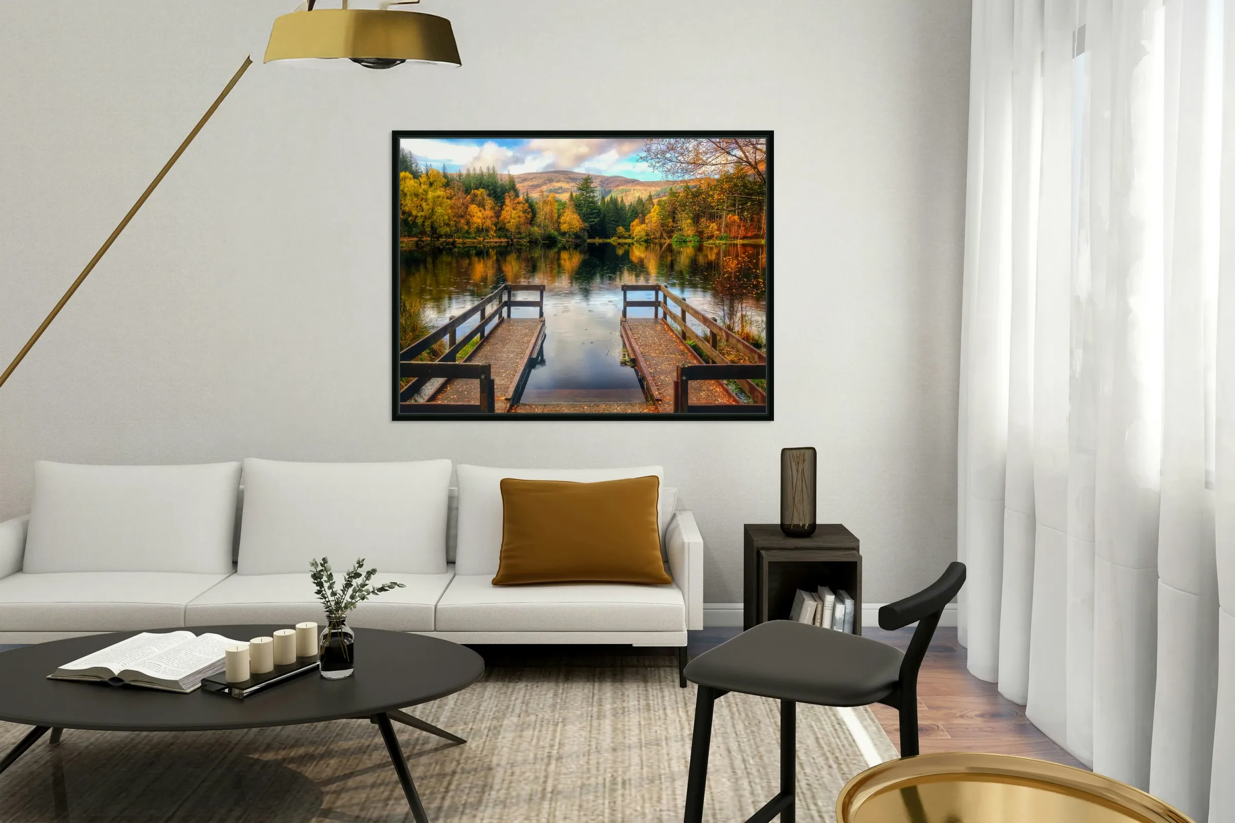 Autumn colours surround Glencoe Lochan in the Scottish Highlands with rich tones reflected in the still water. In the foreground a quiet boat jetty reaches out over the lochan while light rain dimples the surface adding a sense of calm and transience. A great photograph for those who appreciate the gentle mood of Highland autumns and moments of quiet reflection in nature.