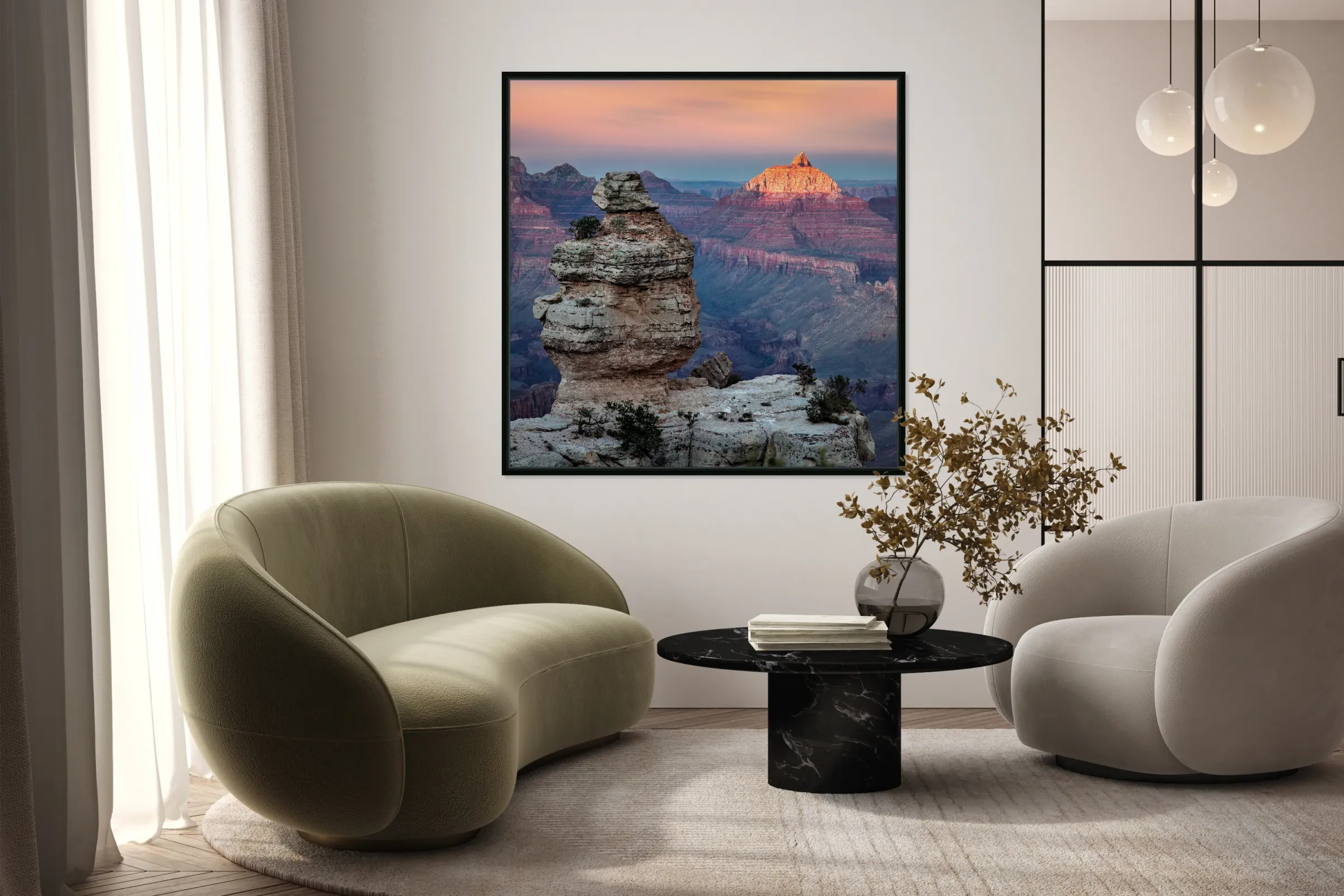 The South Rim of the Grand Canyon at sunset where a sharp peak catches the last golden light of the day. The warm glow lingers on the rock face as the canyon begins to darken capturing a moment of quiet drama in one of the world’s most iconic landscapes. A great photograph for anyone drawn to the power and scale of nature at its most atmospheric.