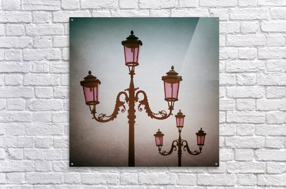 Two ornate city lamps stand in silhouette against the sky in Venice Italy. Their decorative ironwork and elegant shapes are clearly defined contrasting with the lighter tones behind them. These classic Venetian lamp posts are a familiar part of the city’s visual identity often seen lining canals piazzas and historic streets. Their distinctive style reflects the artistic and architectural traditions that have shaped Venice over centuries. Ideal for lovers of European cityscapes architectural detail or Italian heritage. Available as wall art and in a wide range of other print and product formats.