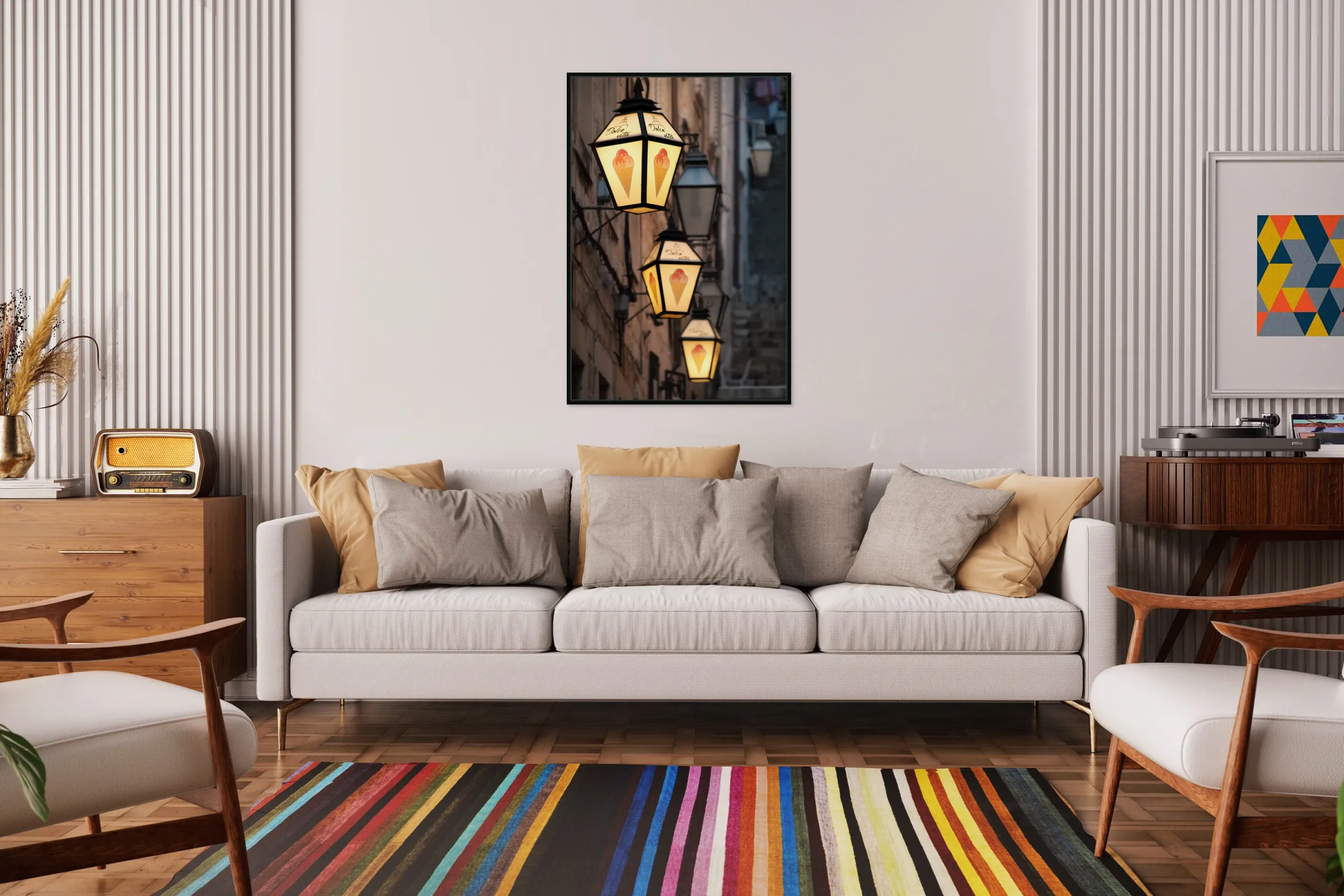 A row of warmly lit lamps lines the exterior of a restaurant on a quiet backstreet in Dubrovnik Croatia. As dusk settles over the old stone buildings the lamps cast a soft glow onto the surrounding architecture adding a touch of warmth to the scene. Each lamp features an image of an ice cream cone adding a playful inviting character to the narrow alleyway. Tucked away from the main thoroughfares this small corner of Dubrovnik captures the charm of the city’s lesser-seen streets. Known for its medieval walls terracotta rooftops and limestone lanes the city offers countless intimate scenes like this where tradition and tourism quietly coexist. The lamps themselves serve both as lighting and advertisement merging practicality with atmosphere in the heart of the old town. This image is ideal for anyone seeking travel-themed wall decor or a touch of European character in their home or workspace. Available as wall art and across a wide range of products.