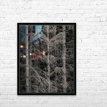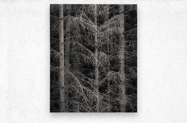 Tall slender tree trunks and a tangle of bare branches rise from the edge of a forest in Wester Ross Scotland. The leafless forms stand out starkly against the dark interior woodland their fine lines and repeated verticals creating a striking semi-abstract composition that hints at the quiet density beyond. This scene captures the raw stillness of the Scottish Highlands in winter when the trees are stripped back to their bare structure and the forest takes on a mood of quiet isolation. Wester Ross is known for its remote beauty and unspoiled natural landscapes and this forest edge offers a glimpse into that atmosphere of solitude and depth. Available as wall art or across a broad selection of formats this image suits lovers of natural minimalism abstract forms in nature and evocative northern landscapes.
