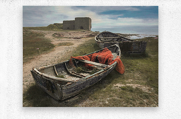 Two abandoned wooden rowing boats lie on the grassy shore at Boddin Point in Angus Scotland with the weathered stone remains of the old lime kiln standing in the background. One of the boats contains a tangle of red fishing net providing a vivid contrast to the muted tones of the boats and surrounding landscape. Overhead a bright blue sky is scattered with white cloud. Boddin Point sits on the east coast of Scotland near Montrose a stretch of shoreline known for its rugged beauty and industrial relics. The lime kiln once used in 18th and 19th-century lime production now stands as a crumbling reminder of the area’s maritime and industrial past. The abandoned boats and disused structure capture the passage of time along this quiet coastal outpost. This photograph is well suited for anyone drawn to rustic maritime scenery coastal textures or historical Scottish locations. Available as wall art and in a wide range of other product formats. ..... Please Note: This image is intentionally presented with a grainy texture as part of its aesthetic.