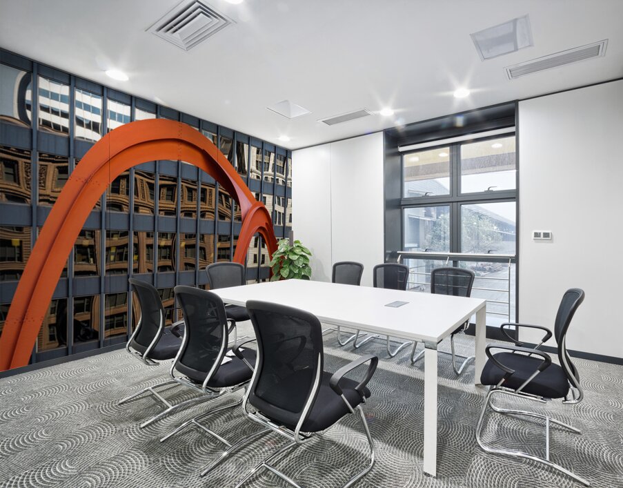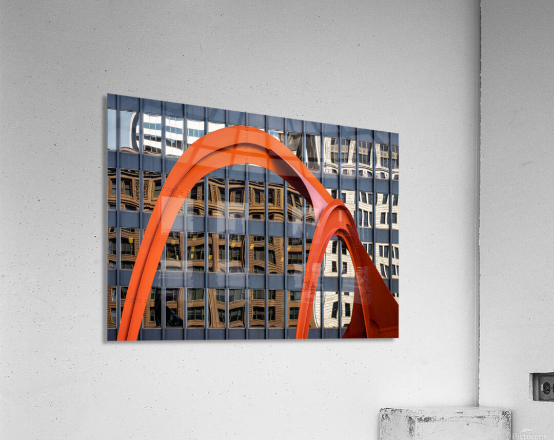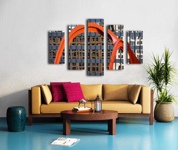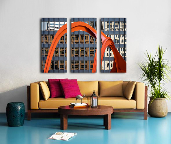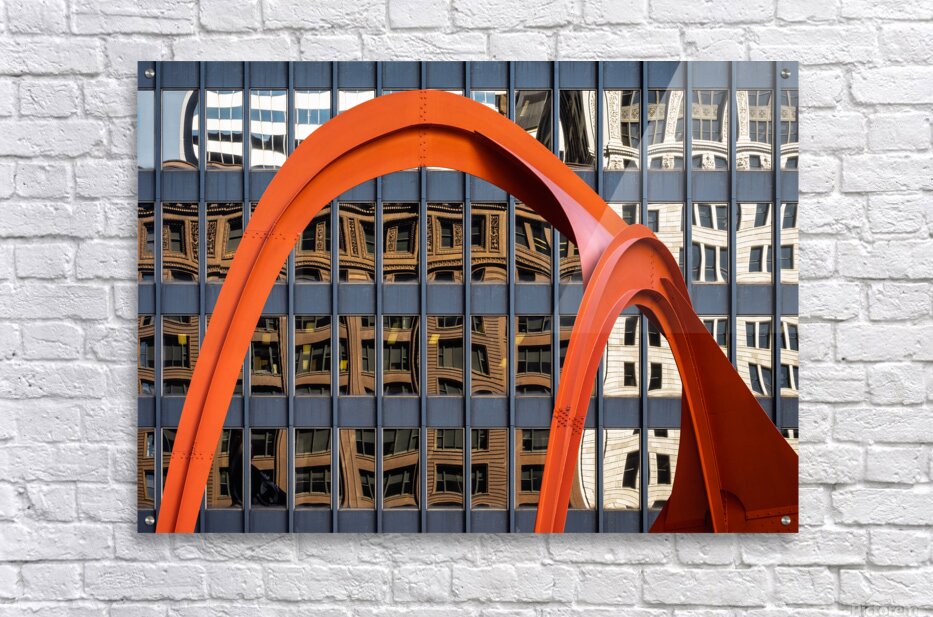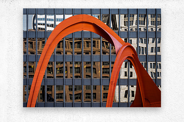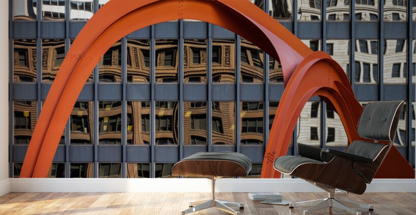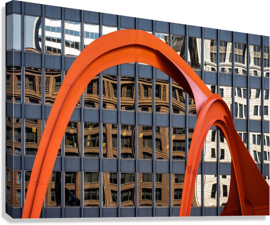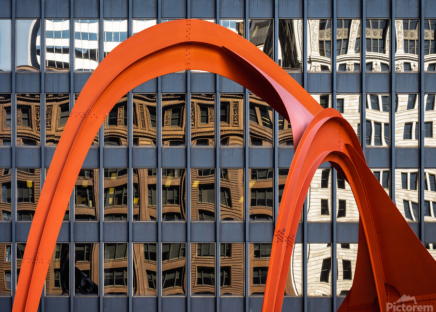 The bold red steel arcs of Alexander Calder’s Flamingo sculpture rise against the glass façade of the Kluczynski Federal Building in Chicago Illinois. Its sweeping curves cut across the grid of reflective windows where the distorted reflections of surrounding architecture ripple and dance across the surface. The interplay of organic form and rigid geometry creates a dynamic visual tension highlighting Calder’s mastery in shaping monumental public art that feels both grounded and alive. Installed in Federal Plaza in 1974 Flamingo has become an enduring symbol of Chicago’s modernist cityscape. The vivid International Orange color ensures the sculpture stands apart even amidst the towering architecture that frames it. Seen up close the contrast between its flowing structure and the hard-edged buildings around it offers a reminder of how art can humanize even the most imposing of urban environments. Perfect for admirers of modern art architecture and city life this piece captures the vibrancy of Chicago’s cultural identity. It makes a striking addition to contemporary interiors offering both bold color and an abstract sense of movement that resonates well beyond the frame.