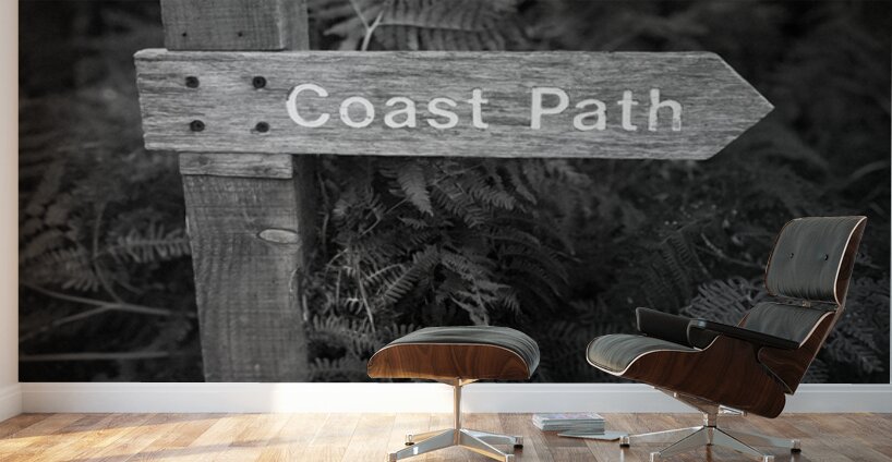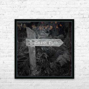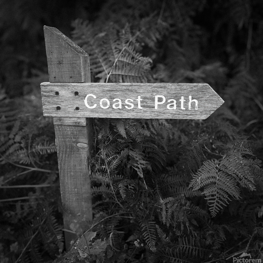 A weathered wooden sign stands quietly among the ferns its arrow pointing the way forward with the words Coast Path neatly etched in white. The monoch...[+]