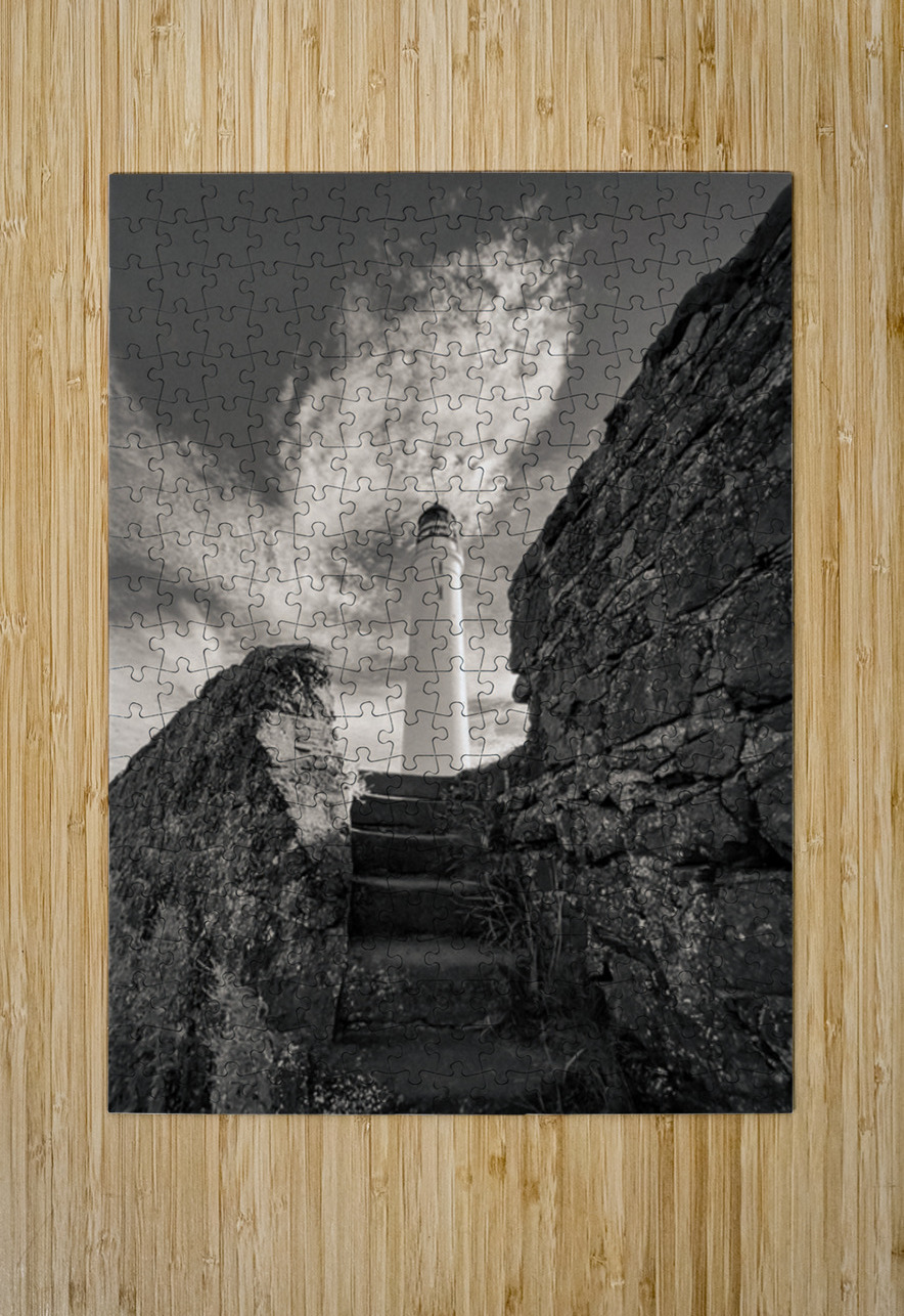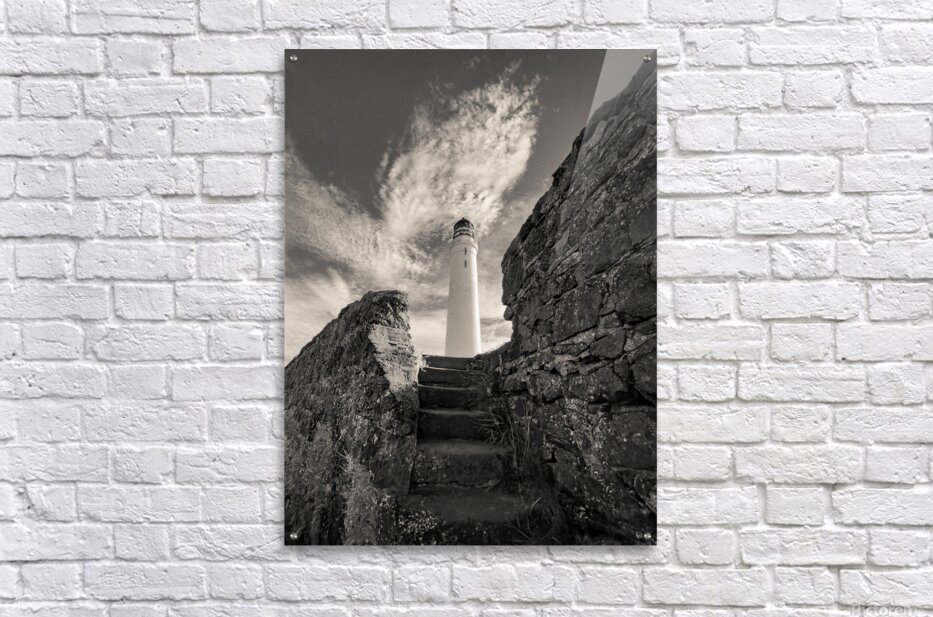 Weathered stone steps climb from the shoreline towards the Scurdie Ness Lighthouse in Montrose Scotland. The view is framed by rugged walls on either side drawing the eye upward to the tall white tower set against a textured sky streaked with drifting clouds. Built in the 19th century Scurdie Ness Lighthouse has guided mariners safely along the Angus coast for generations. Its location at the mouth of the River South Esk made it a vital landmark for navigation and today it remains an enduring feature of Montrose’s coastal heritage. A great photograph for anyone who appreciates maritime history dramatic coastal architecture or the striking presence of lighthouses. This image is available as wall art and across a wide range of formats to suit your space or style. ..... Please Note: This image is intentionally presented with a grainy texture as part of its aesthetic.
