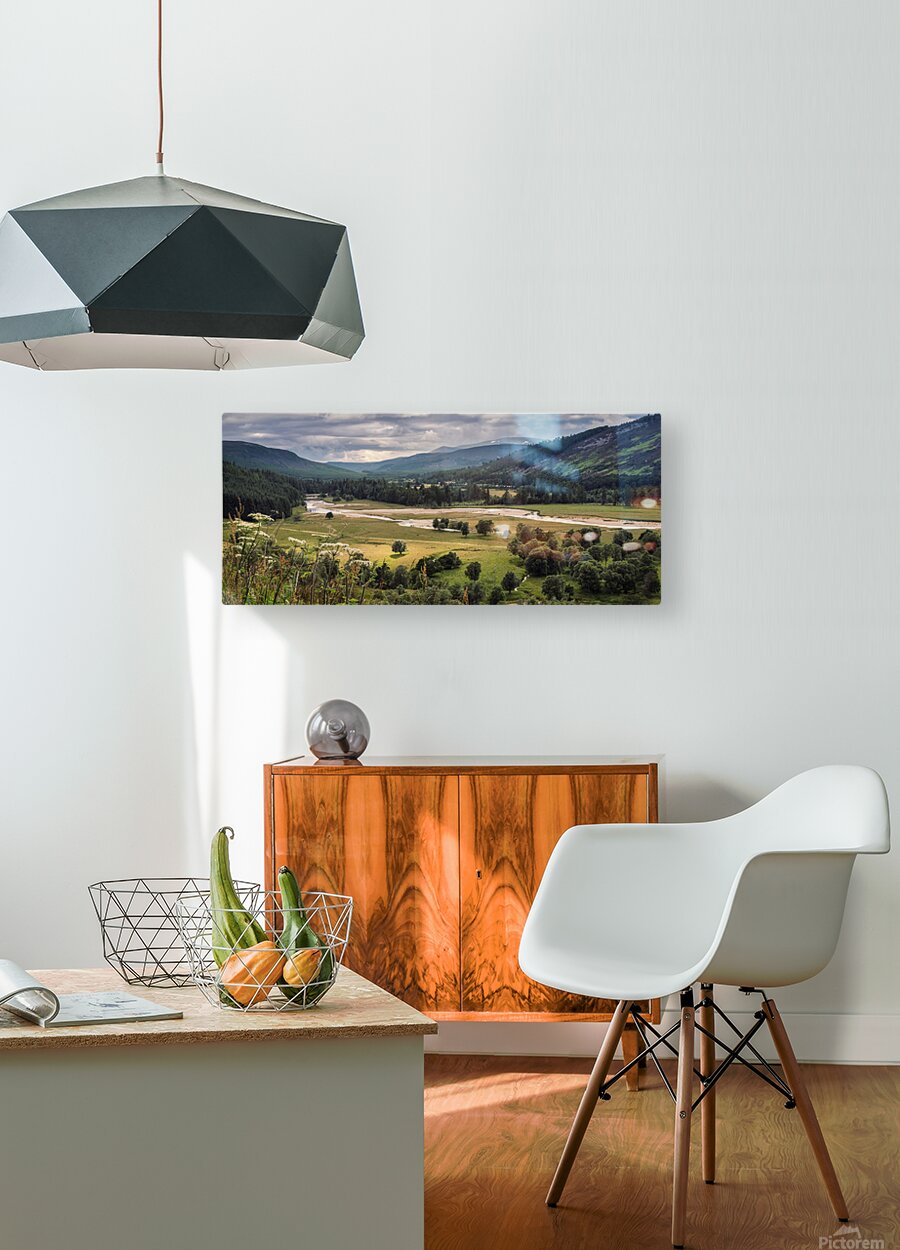 A panoramic view stretches across the Linn of Dee Valley towards Mar Lodge Estate in the Cairngorms National Park Aberdeenshire. The River Dee winds gently through the landscape reflecting shifting light beneath a sky of layered clouds. Rolling hills and dense woodlands frame the valley creating a sense of depth and scale within this Highland scene. The Linn of Dee is a gateway to some of Scotland’s most dramatic mountain landscapes and is closely tied to the history of Mar Lodge Estate once a Victorian sporting retreat. Today the area is managed as part of a national nature reserve balancing conservation with public enjoyment. Its rivers glens and forests provide a haven for red deer golden eagles and other iconic Scottish wildlife. A great photograph for those who love sweeping Highland landscapes and natural scenery this image is available as wall art and across a wide range of formats to suit your space or style.