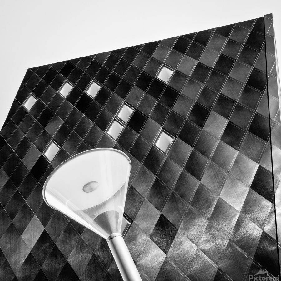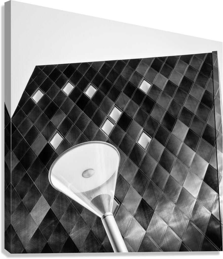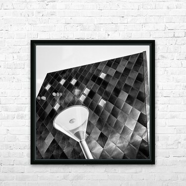 An abstract monochrome study of the Jewish Museum in San Francisco California. The angular exterior with its diamond-patterned façade is captured from a dramatic perspective that highlights sharp geometry and striking contrast. A modern streetlight in the foreground adds another layer of form and texture against the architectural backdrop. San Francisco is a city celebrated for its cultural landmarks and bold architecture and the museum stands as a striking example of contemporary design within its historic urban landscape. The clean lines and unusual perspective give the composition a distinctive graphic quality. A great photograph for admirers of modern architecture geometric design and abstract urban studies. This image is available as wall art and across a wide range of formats to suit your space or style.
