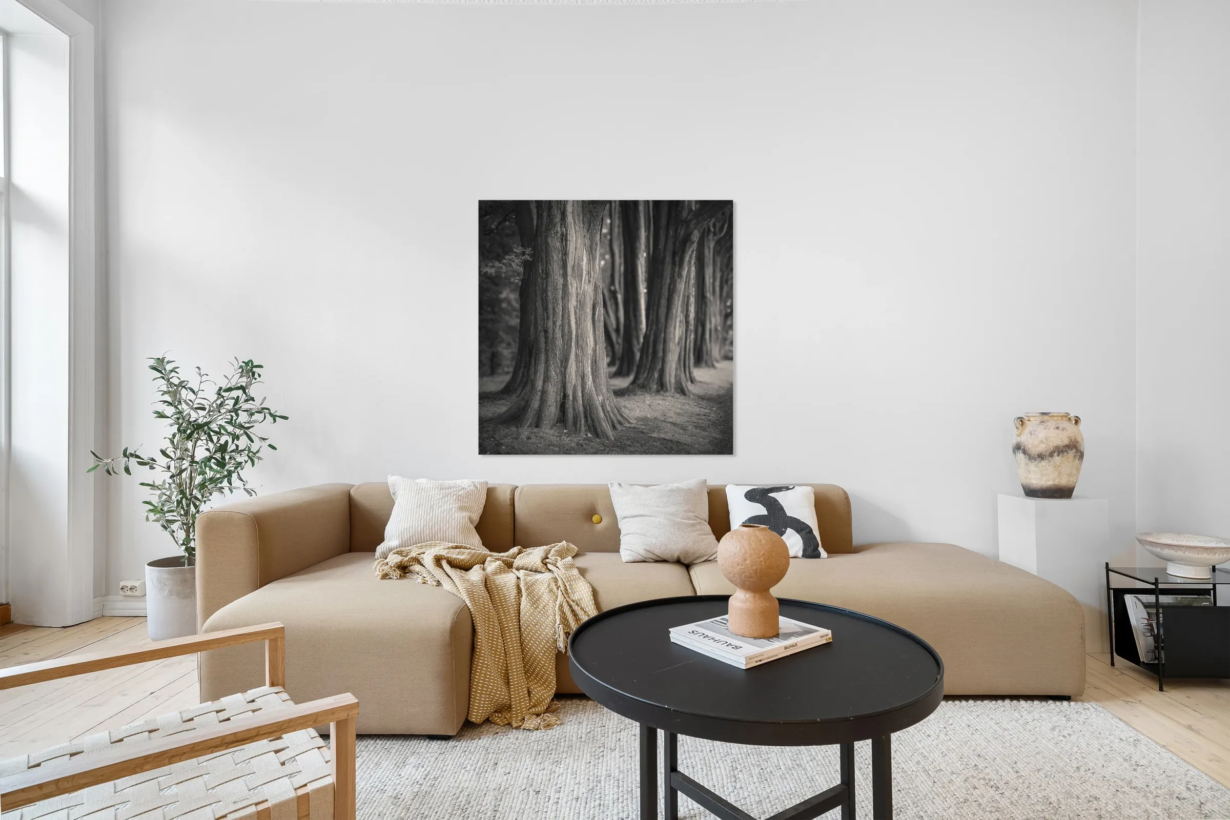A quiet grove of trees stands in soft monochrome light their trunks forming gentle curves that lead the eye through the scene. The textures of the bark and the subtle fall of light across the ground give a sense of timeless stillness where each tree seems to hold its own quiet presence. Captured on the Plas Newydd estate in Anglesey North Wales this image highlights the beauty of mature woodland shaped by age and time. The composition draws attention to the graceful form of the trunks and the depth created by their rhythmic spacing evoking a calm and meditative atmosphere. A perfect photograph for those who appreciate nature’s quiet strength and elegant simplicity. This image is available as wall art and across a wide range of formats to suit your space or style.