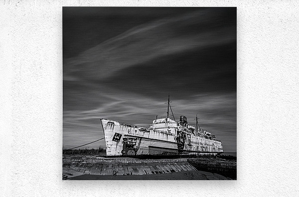 A monochrome photograph of the TSS Duke of Lancaster a former railway steamer passenger ship now permanently grounded at Llannerch-y-Mor Wharf near Mostyn Docks on the River Dee in North Wales. The ship’s bright white hull still bearing traces of graffiti from its more recent past stands in striking contrast against a deep blue sky with a scattering of wispy clouds overhead. The Duke of Lancaster operated between 1956 and 1979 serving as a passenger and car ferry across routes in Europe. After being retired from service it was brought ashore with plans to convert it into a leisure and entertainment venue though those plans never fully materialised. Today the vessel remains a distinctive landmark along the Welsh coastline its faded grandeur and unique setting continuing to attract photographers urban explorers and those drawn to forgotten maritime history. This photograph is ideal for anyone with an interest in industrial heritage maritime history or minimalist coastal scenes. A striking addition to modern interiors it is available as wall art and a wide range of other product formats.