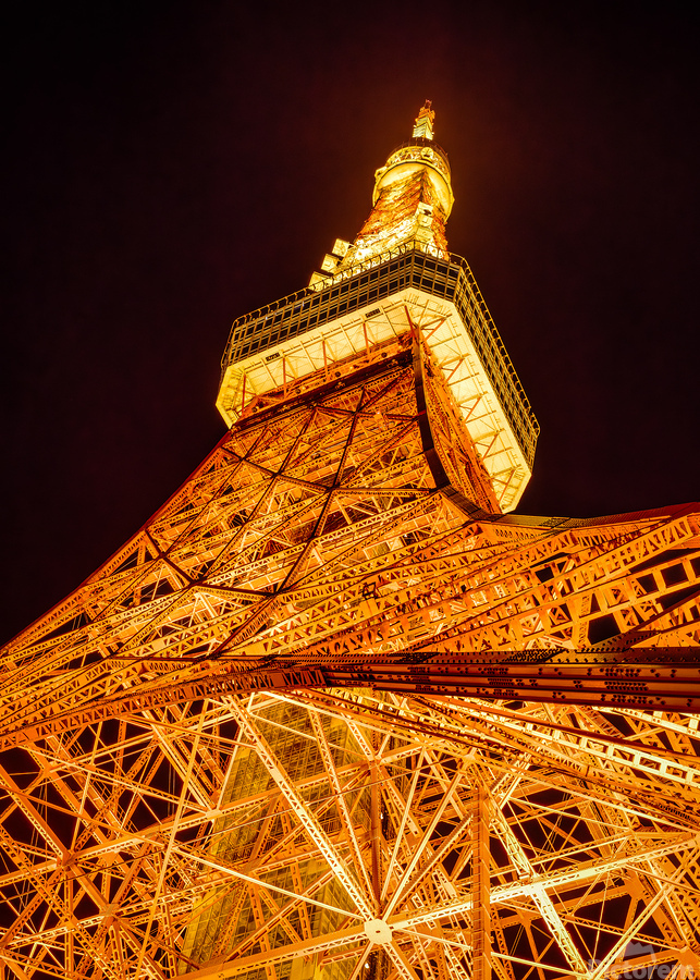 Tokyo Tower rises sharply into the night sky its lattice structure glowing in rich amber light from the ground up. Seen from this low angle the steel ...[+]