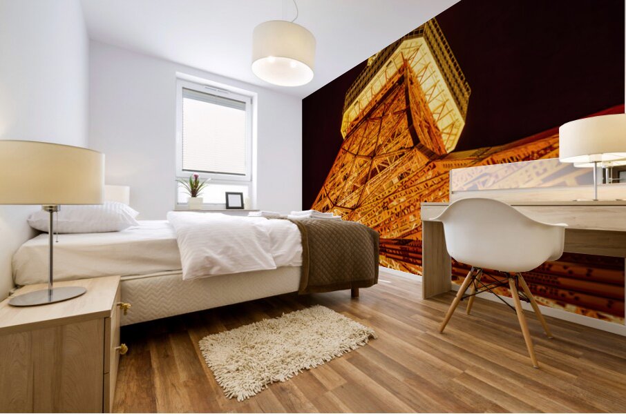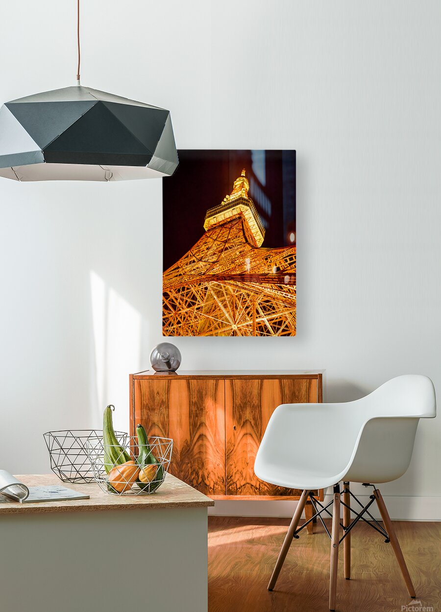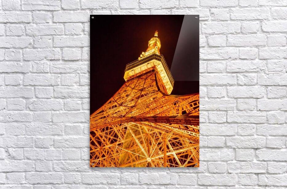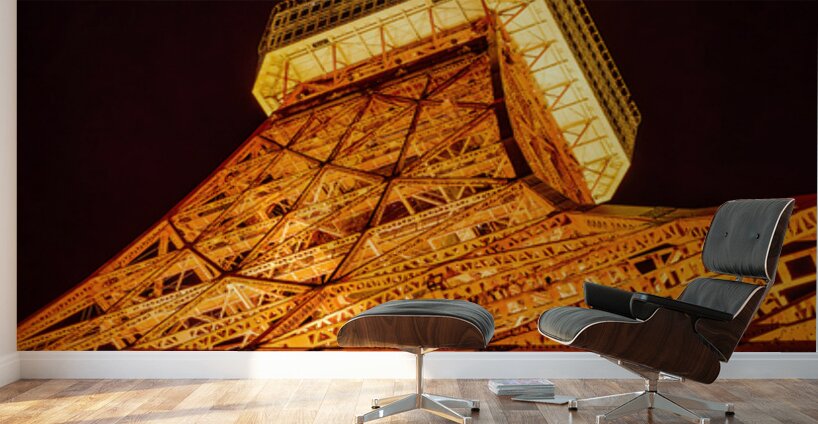 Tokyo Tower rises sharply into the night sky its lattice structure glowing in rich amber light from the ground up. Seen from this low angle the steel framework fills the frame with repeating lines and geometric detail creating a bold and striking presence. The deep black sky isolates the tower completely allowing the warm illumination to dominate and giving the image a strong graphic impact that feels confident and iconic. Completed in 1958 Tokyo Tower has long been one of the city’s most recognisable landmarks inspired by the Eiffel Tower but firmly rooted in Japan’s post war modern identity. At night its lighting transforms the structure into a beacon over the city emphasising both its engineering and its symbolic role within Tokyo’s skyline. A perfect photograph for lovers of urban architecture iconic city landmarks and dramatic night scenes. This image is available as wall art and across a wide range of formats to suit your space or style.