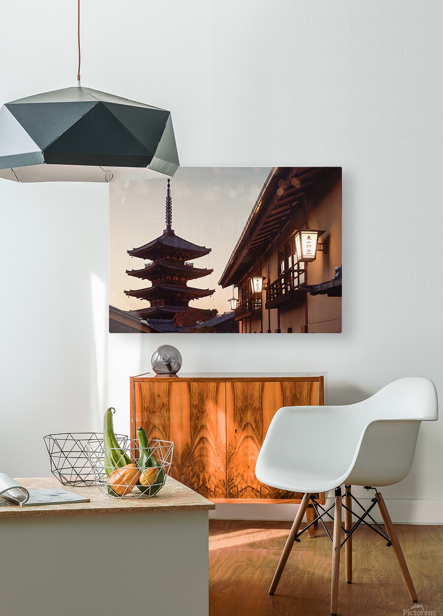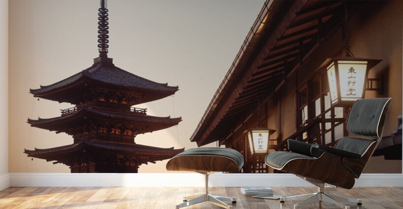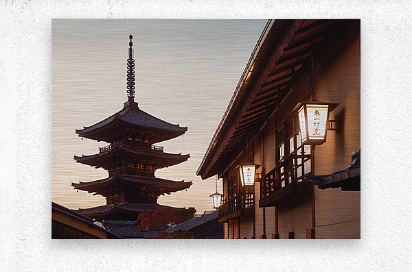 An evening view of Yasaka Pagoda rises calmly above the traditional rooftops of Higashiyama in Kyoto its tiered silhouette set against a soft fading sky. Warm lantern light glows along the wooden buildings in the foreground adding a gentle sense of atmosphere without overpowering the scene. The contrast between the illuminated street and the darkening pagoda creates a quiet balanced moment that feels distinctly Kyoto. Yasaka Pagoda also known as the Tower of Yasaka is a historic Buddhist structure located in the Higashiyama district of Kyoto. The five storey pagoda is one of the city’s most recognisable landmarks standing among preserved streets that reflect Kyoto’s architectural heritage. This area remains a popular spot for visitors looking to experience the traditional character of the city away from modern development. A perfect photograph for fans of Japanese architecture Kyoto landmarks or calm evening city scenes. This image is available as wall art and across a wide range of formats to suit your space or style.