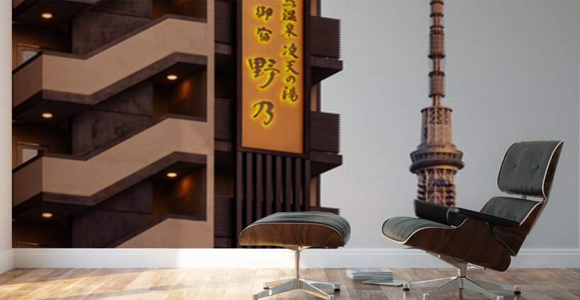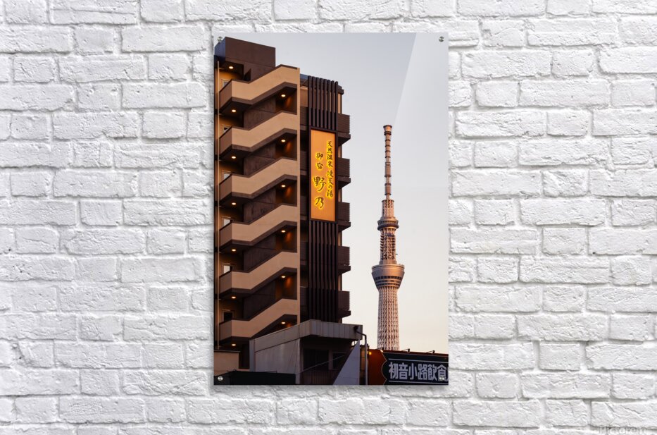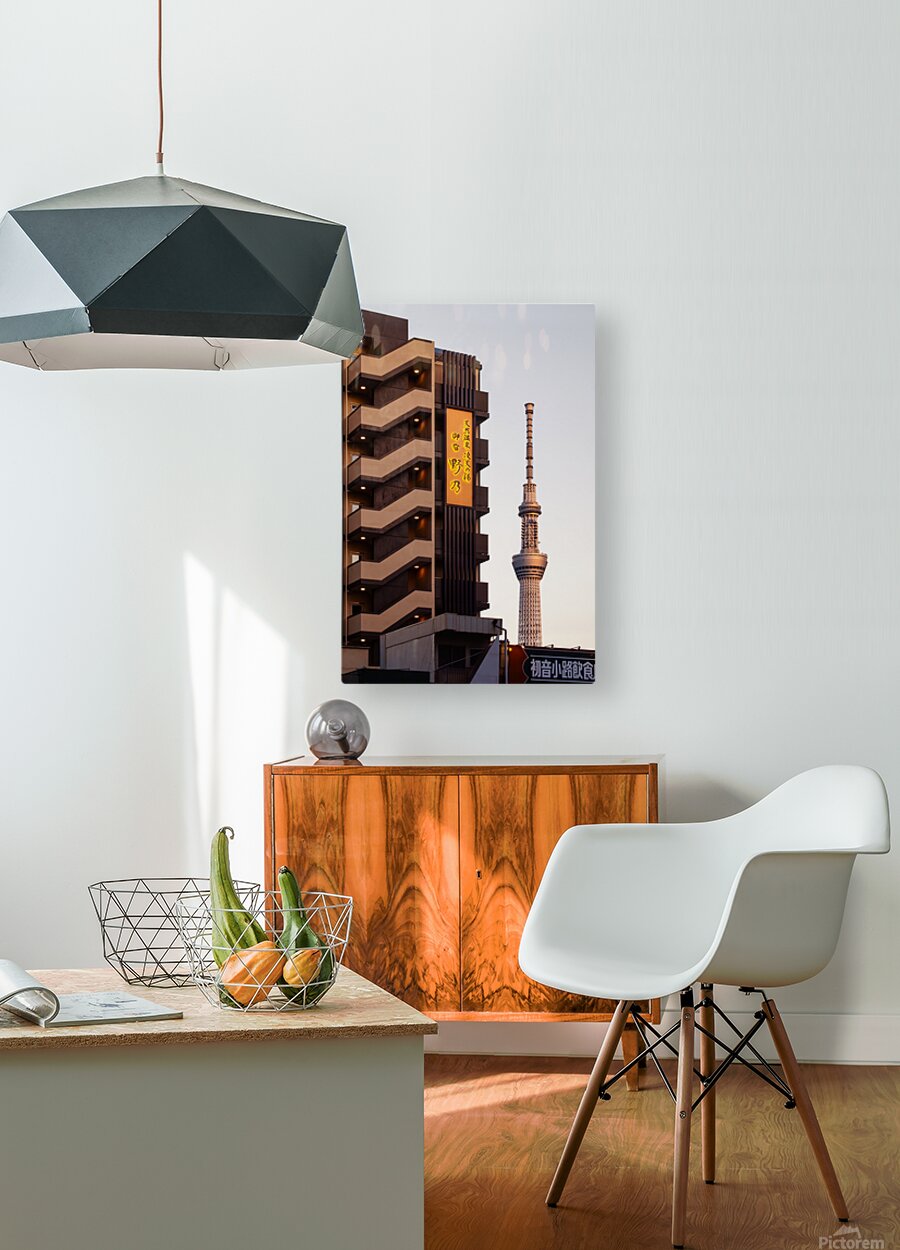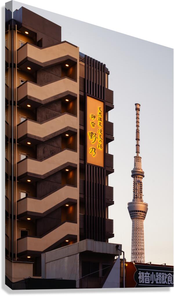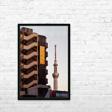 An evening view of Tokyo Skytree stands against a soft fading sky framed by nearby apartment buildings as daylight slips away. Warm lights along an exterior staircase glow gently in the foreground adding a quiet sense of life to the otherwise calm street scene. The mix of everyday architecture and one of Tokyo’s most recognisable landmarks creates a relaxed authentic atmosphere that feels both modern and grounded. Tokyo Skytree is one of the city’s most recognisable landmarks standing over 600 metres tall in the Sumida area of the capital. It serves as a broadcasting tower observation deck and symbol of modern Tokyo’s skyline. The surrounding neighbourhood blends residential buildings small businesses and traditional streets offering a mix of old and new that reflects the character of the city. A perfect photograph for lovers of Tokyo cityscapes modern architecture or peaceful urban evenings. This image is available as wall art and across a wide range of formats to suit your space or style.