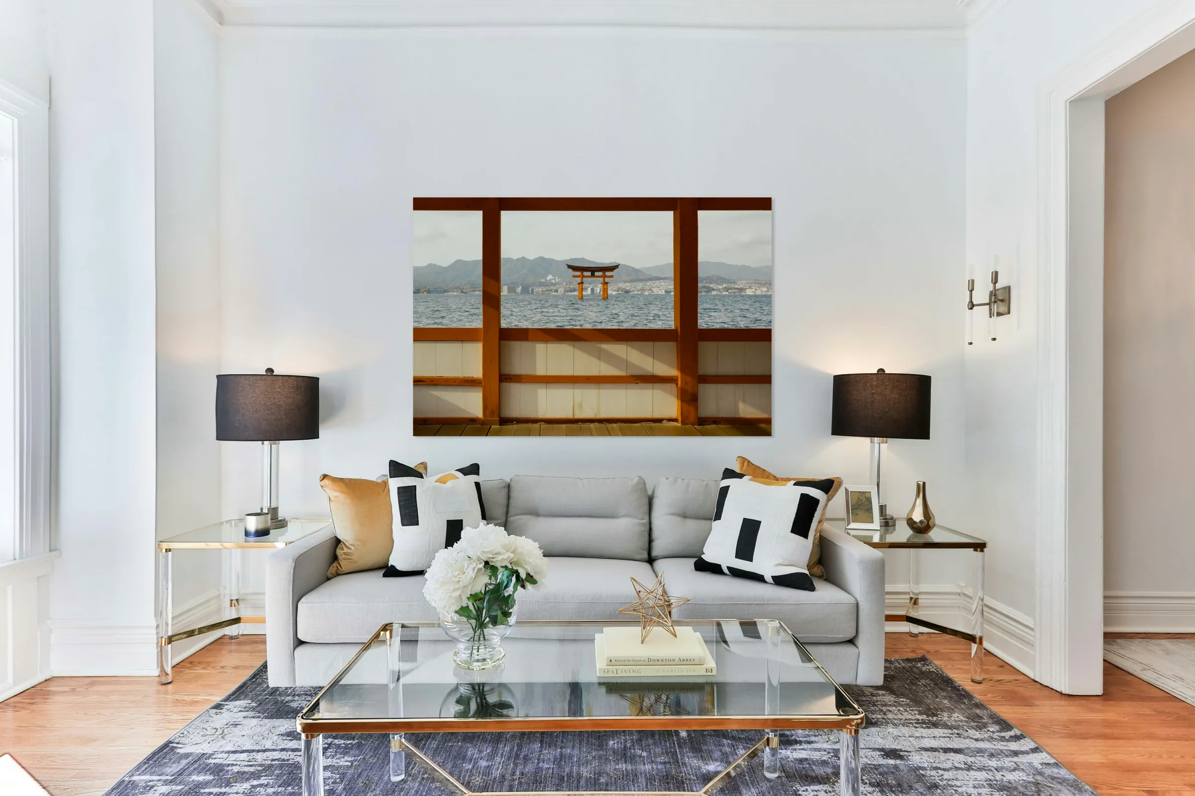 Japanese waters stretch out beyond the wooden structure of Itsukushima Shrine where the famous Otorii Gate stands quietly offshore. The contrast between the warm tones of the shrine’s timber and the cool movement of the sea creates a calm balanced scene with the gate appearing almost suspended between land and water. Distant hills and shoreline buildings sit softly beyond giving the view a sense of depth without distracting from the stillness of the moment. The Otorii Gate of Itsukushima Shrine is one of Japan’s most recognisable cultural landmarks marking the entrance to the sacred shrine complex on Miyajima Island near Hiroshima. Known for its setting in the tidal waters of the Seto Inland Sea the gate appears to float at high tide and rest on exposed ground when the water recedes. Itsukushima Shrine is a UNESCO World Heritage Site and has long been celebrated for its close relationship between architecture and the surrounding landscape. A perfect photograph for lovers of Japanese culture tranquil coastal scenes or spaces that benefit from a sense of calm and balance. This image is available as wall art and across a wide range of formats to suit your space or style.