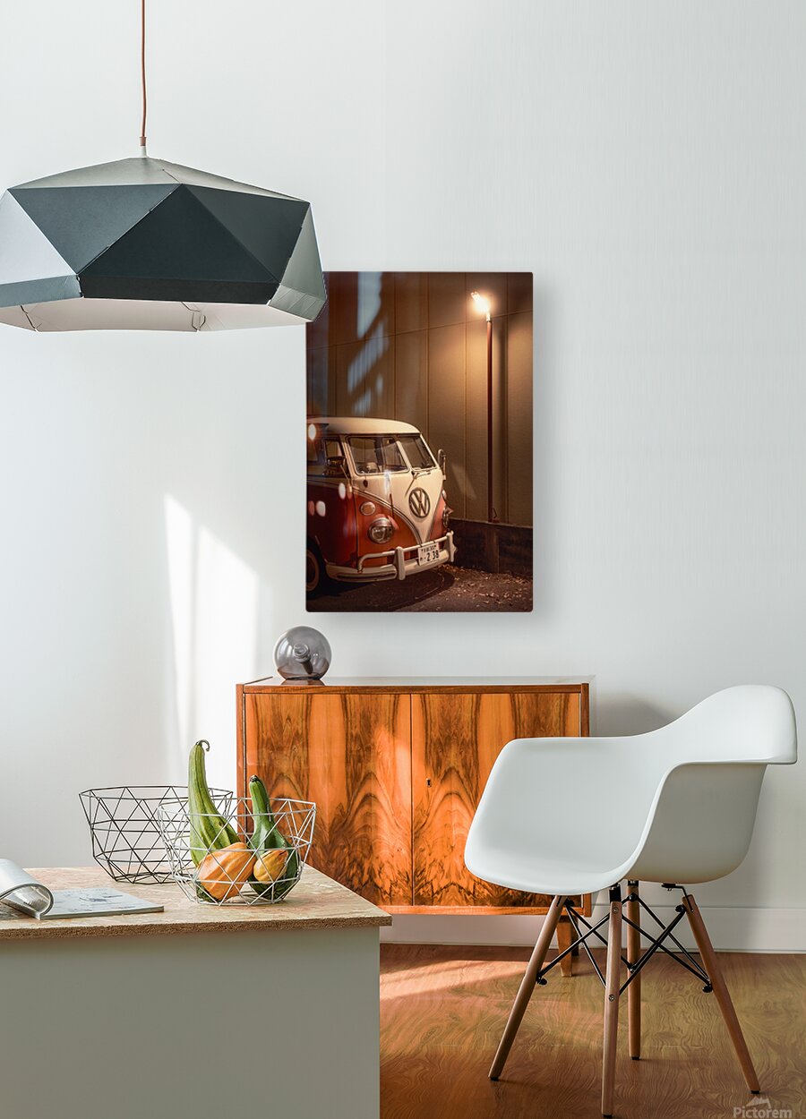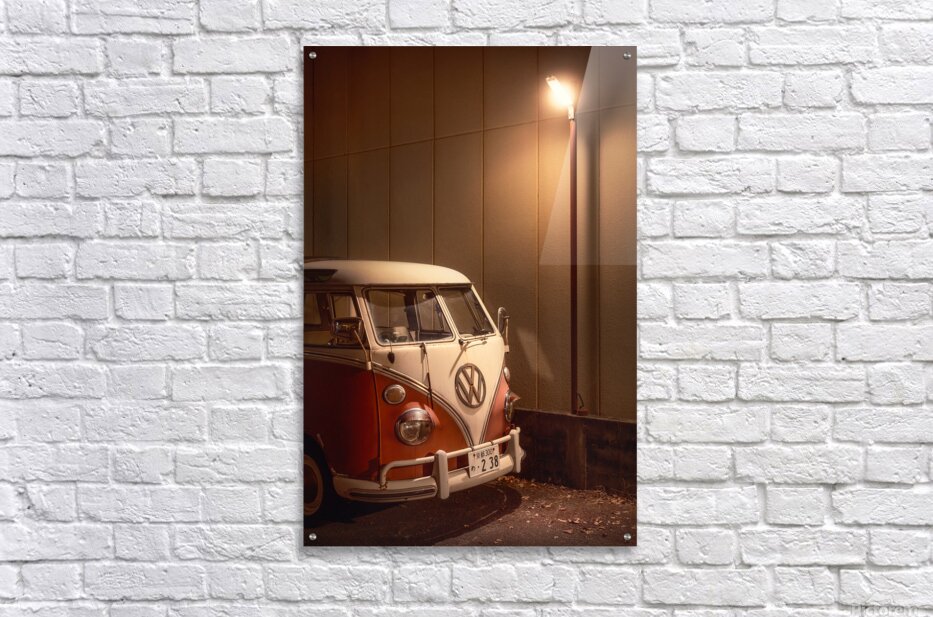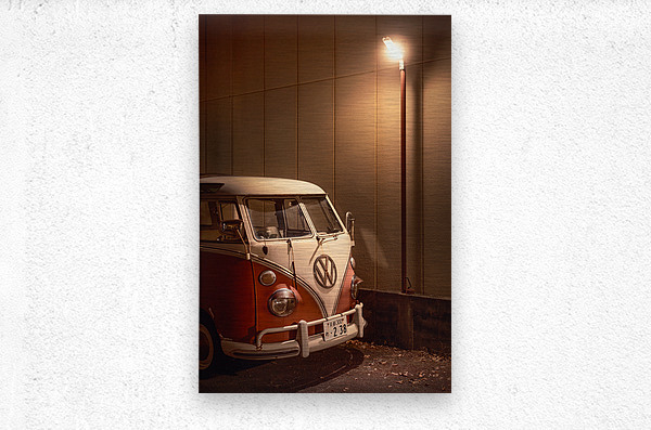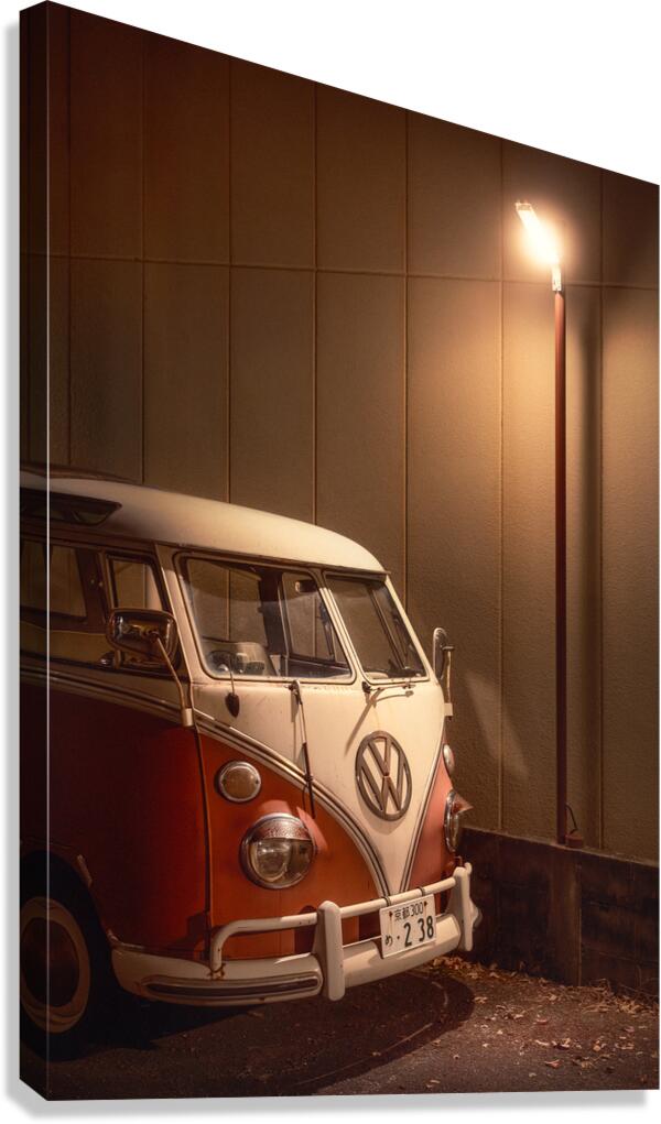 A vintage Volkswagen T1 van sits parked on a quiet backstreet in Kyoto, its red and white body catching the warm glow of a single street lamp. The soft light reflects off the curved metal panels and classic VW badge, while fallen leaves scatter across the ground below. The scene feels calm and unhurried, with the van standing out against the plain wall behind it. Kyoto’s narrow side streets often reveal unexpected details away from the busy tourist areas. This classic Volkswagen, a design icon from the mid 20th century, contrasts with the traditional urban setting, blending vintage European styling with a distinctly Japanese night-time atmosphere. A perfect photograph for those who enjoy classic vehicles, urban night scenes, and quiet moments in historic cities. This image is available as wall art and across a wide range of formats to suit your space or style.