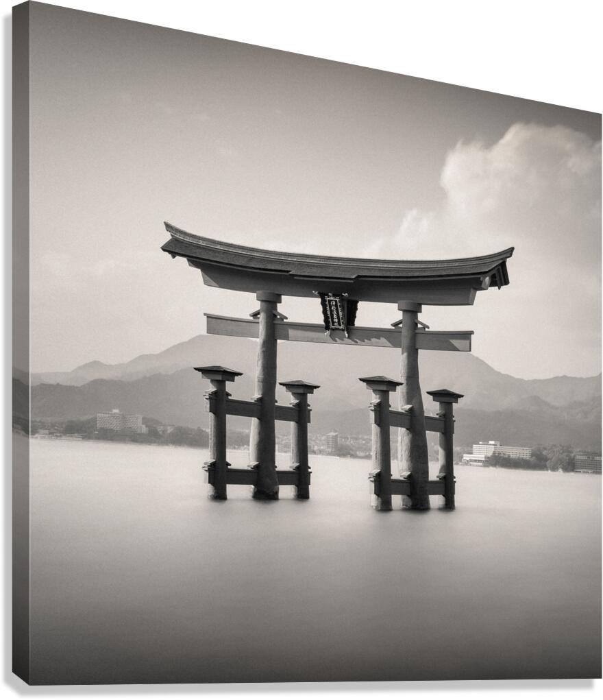 Rising from the still waters of the Seto Inland Sea the Great Torii of Itsukushima Shrine stands quietly offshore from the island of Miyajima in Hiroshima Japan. The long exposure smooths the surrounding water to a calm surface allowing the distinctive form of the sacred gate to stand in quiet isolation against the distant shoreline and soft outline of the mountains beyond. The torii gate known as the Sacred Gate of Miyajima marks the entrance to the revered Itsukushima Shrine. First established in the 12th century and rebuilt several times over the centuries the torii appears to float at high tide creating one of Japan’s most recognisable and enduring cultural landmarks. This image is ideal for collectors of Japanese architecture spiritual landmarks and minimalist coastal scenes. The balanced composition and tranquil atmosphere make it a striking piece of wall art and this image is available as wall art and across a wide range of formats to suit your space or style.
