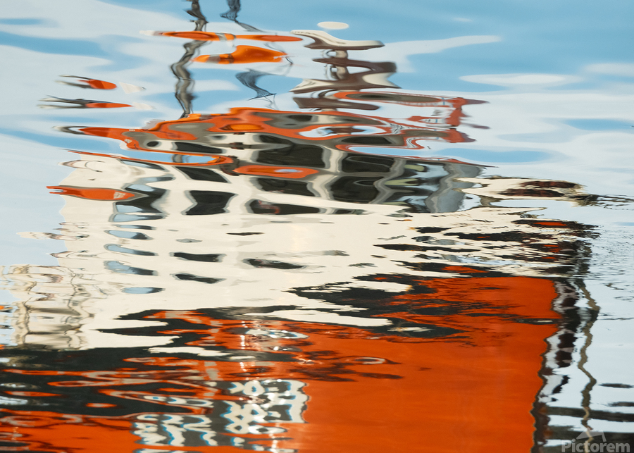 Colour and shape break apart across the water at Port Askaig on the Isle of Islay where the reflection of a boat dissolves into shifting lines and fra...[+]