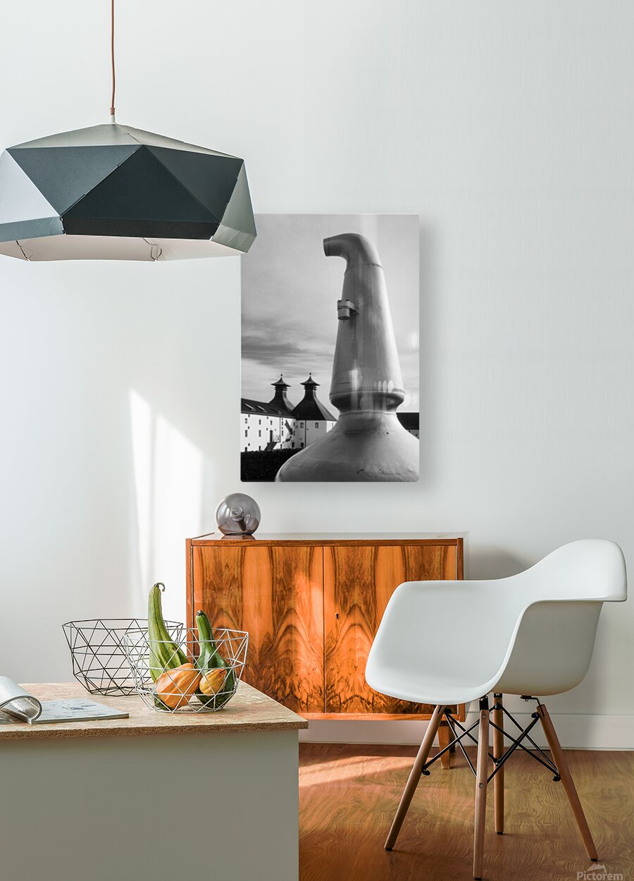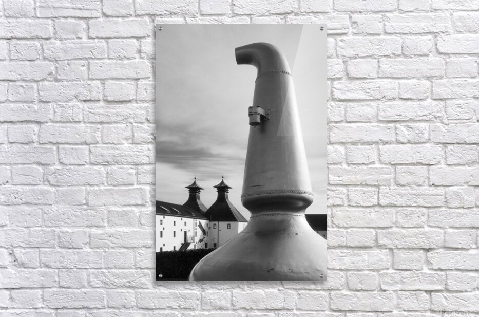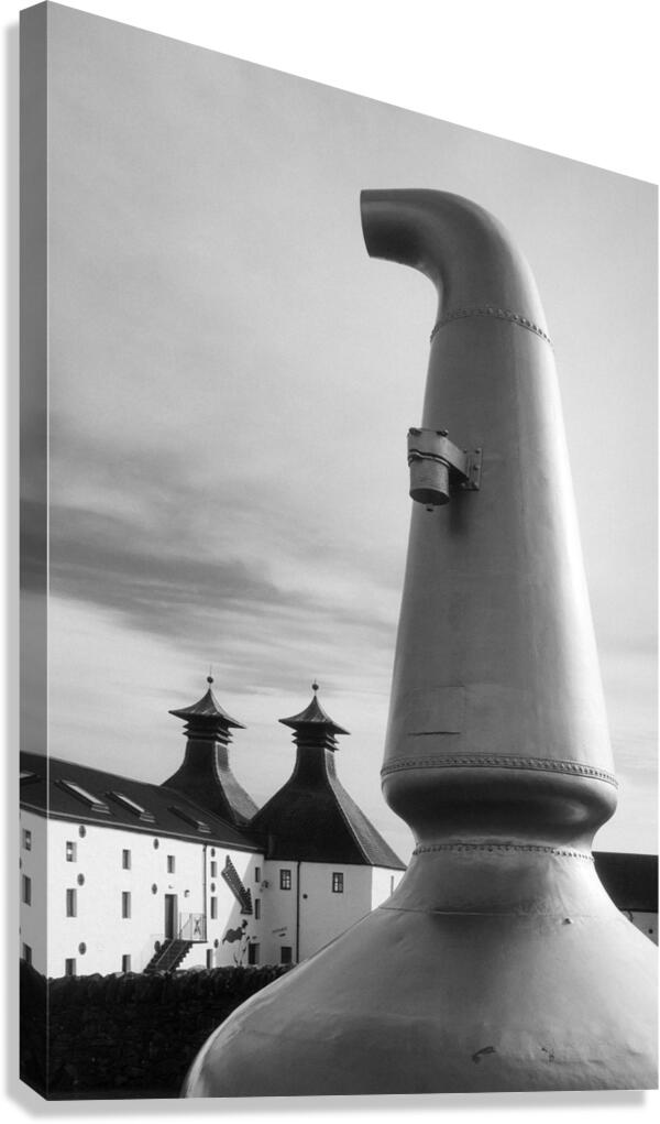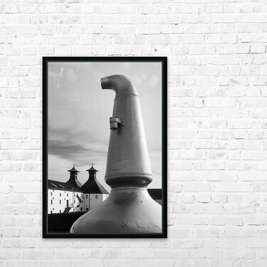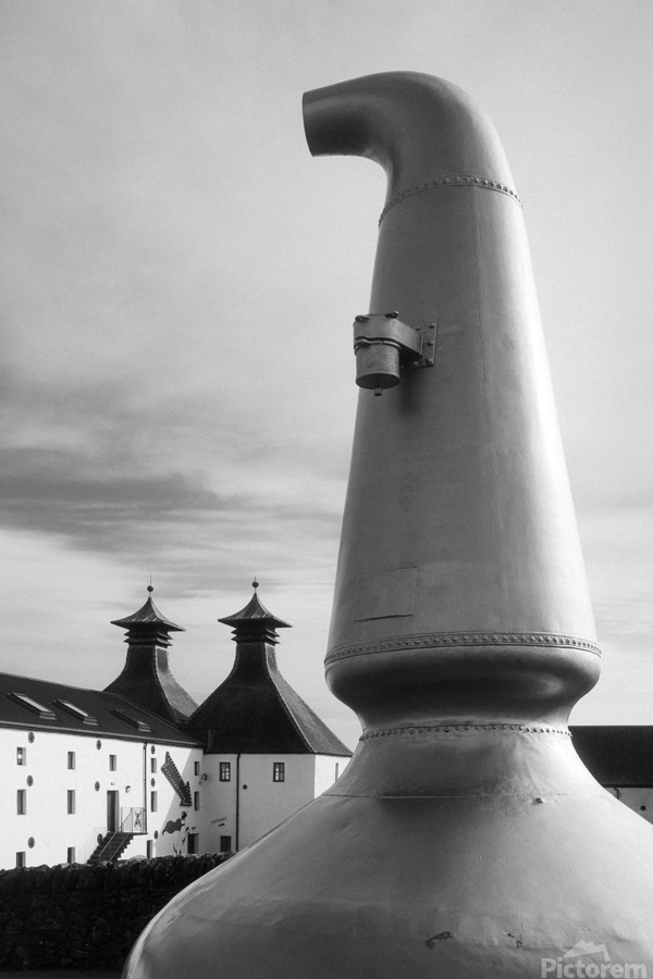 There’s something quietly iconic about this form the curved neck of the old copper still rising with a sense of weight and purpose at the entrance to Ardbeg Distillery on the Isle of Islay. It feels grounded and familiar a shape tied closely to place and tradition standing just apart from the buildings behind it as if holding onto its own story. Ardbeg sits on the southern coast of Islay in the Inner Hebrides of Scotland a region long associated with whisky production. The pot still is central to that process its design shaping the character of the spirit itself and here it’s been placed outside as a kind of marker linking the working distillery to its heritage. A perfect photograph for those drawn to whisky culture Scottish island life and strong recognisable forms with a sense of history. This image is available as wall art and across a wide range of formats to suit your space or style. ..... Please Note: This image is intentionally presented with a grainy texture as part of its aesthetic.