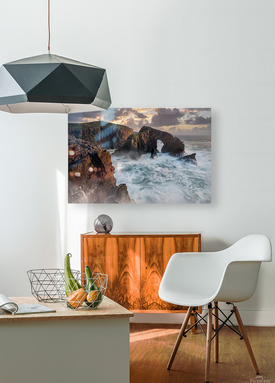 Stac a' Phris is a stunning sea arch located on the Isle of Lewis in the Outer Hebrides, Scotland, UK. This awe-inspiring rock formation majestically overlooks the turbulent North Atlantic Ocean. At sunset, the golden light illuminates the natural arch, creating a breathtaking and picturesque scene. This photograph captures the remarkable beauty of Stac a' Phris under the dramatic sunset sky, highlighting the rugged coastal landscape and the serene yet powerful ambiance of the North Atlantic. Ideal for those seeking images of Scotland's natural wonders, coastal rock formations, and scenic sunsets.
