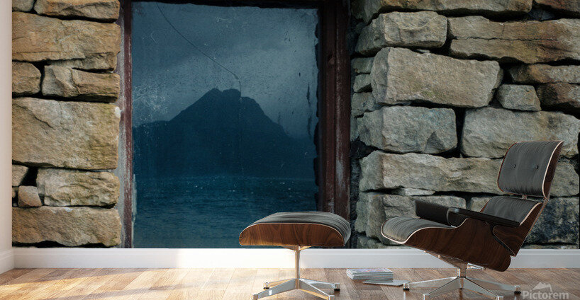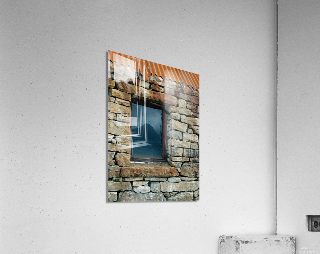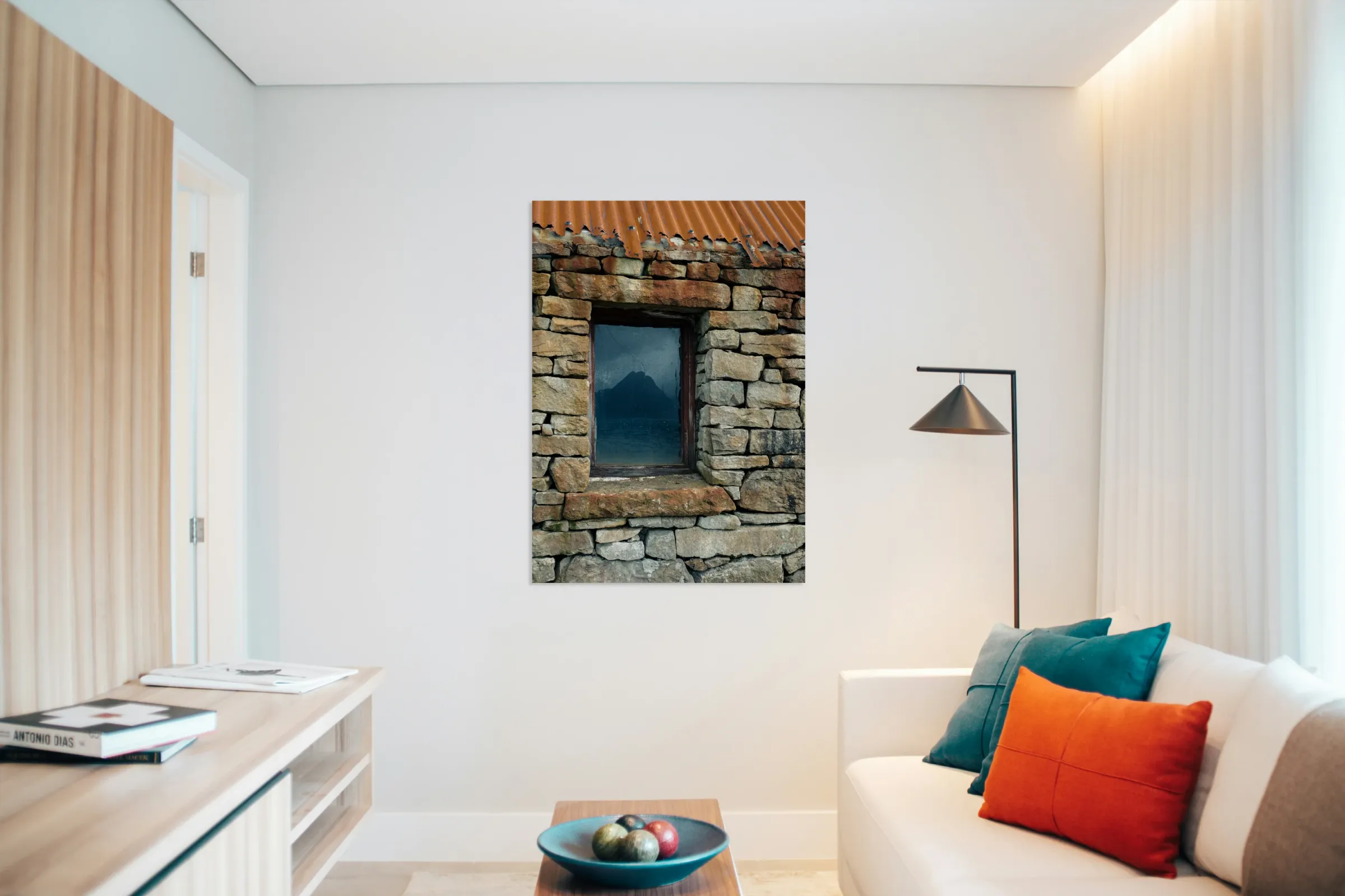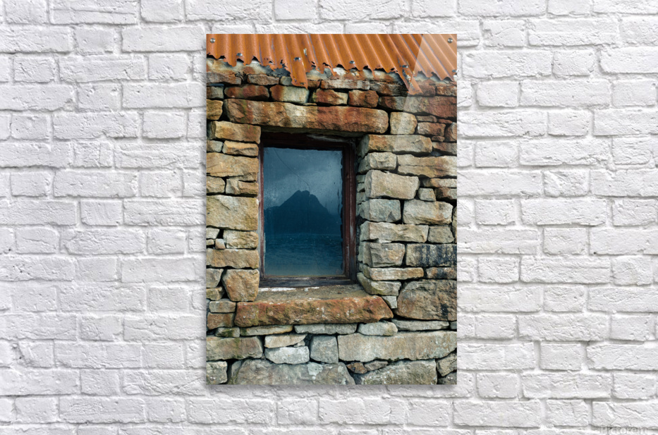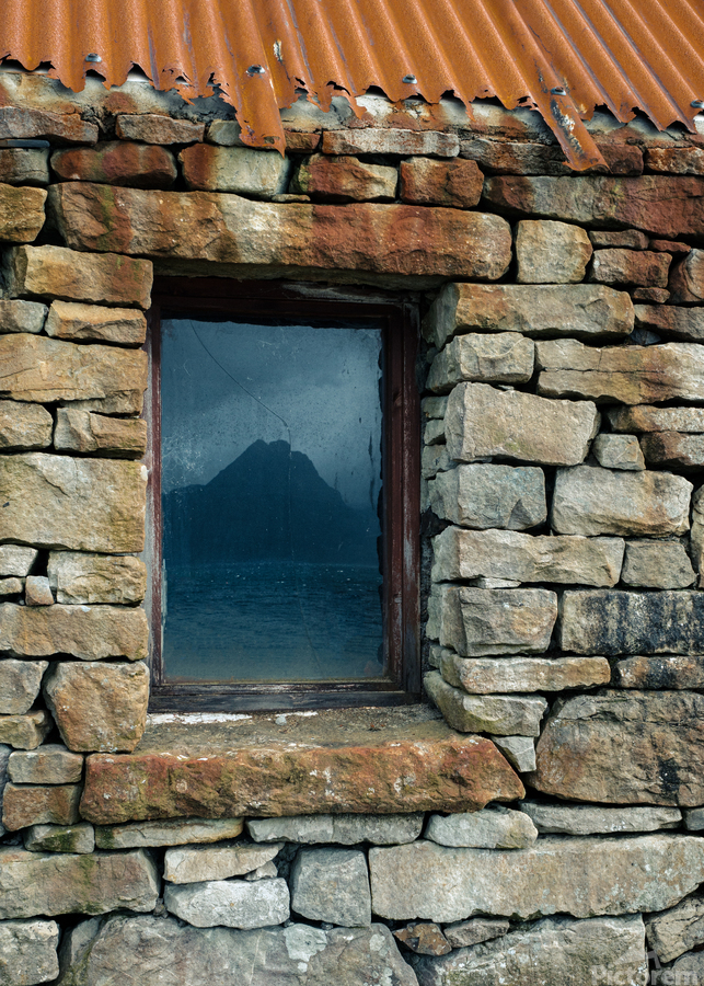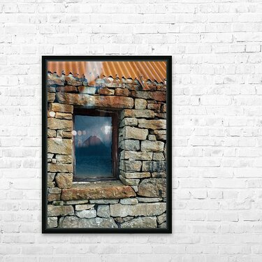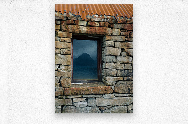 The Cuillin mountains are reflected in the window of an old stone building in Elgol, on the Isle of Skye. Its weathered walls and rusty corrugated roof speak of years gone by, standing quietly against the rugged backdrop of Scotland's landscapes. A great photograph for those drawn to the connection between nature and the traces of human history.
