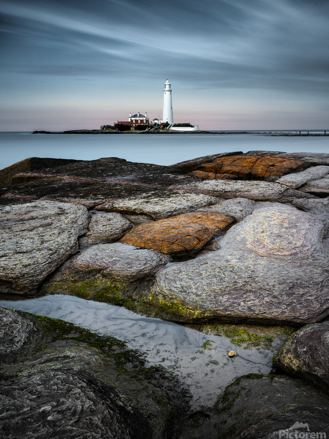 A long exposure photograph of St. Mary's Lighthouse, captured from the mainland in Tyne and Wear, UK. The image showcases smooth, eroded rocks with a small rock pool in the foreground, offering a serene and timeless coastal scene. The soft movement of water contrasts with the static presence of the lighthouse, creating a tranquil atmosphere. The ideal photograph for coastal photography enthusiasts or those seeking a peaceful seascape for their collection.