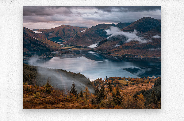 From Mam Ratagan Pass in Glen Shiel, Loch Duich stretches quietly across the Scottish Highlands in the soft light of early morning. Autumnal trees add vibrant colour to the scene, while a cloudy sky hangs above the still loch, completing the tranquil setting. The Scottish Highlands are renowned for their dramatic landscapes, and Loch Duich offers a serene example of this natural beauty in autumn. The combination of water, sky, and seasonal foliage creates a distinctive Highland atmosphere. This image captures the calm and serene beauty of Loch Duich, offering a visually striking and peaceful addition to any wall. This image is available as wall art and across a wide range of formats to suit your space or style.