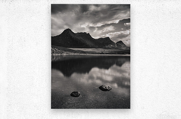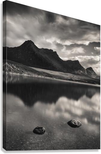 The serene beauty of Ben Loyal mountain reflected in the calm waters of Lochan Hakel, Sutherland, in the Scottish Highlands. The stillness of the loch perfectly mirrors the majestic mountain, while clouds drift above, adding a soft, ethereal touch to the scene. A great photograph for those who appreciate the tranquil and awe-inspiring landscapes of Scotland’s wild beauty.