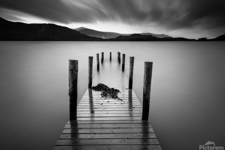 A quiet moment on a wooden jetty overlooking Derwent Water in the Lake District, where a cluster of autumn leaves has gathered between the boards. Captured with a long exposure looking down the length of the jetty, the image draws the eye through the posts toward distant hills, while streaked clouds sweep overhead. A great photograph for those who appreciate calm, seasonal details set within a dramatic landscape.