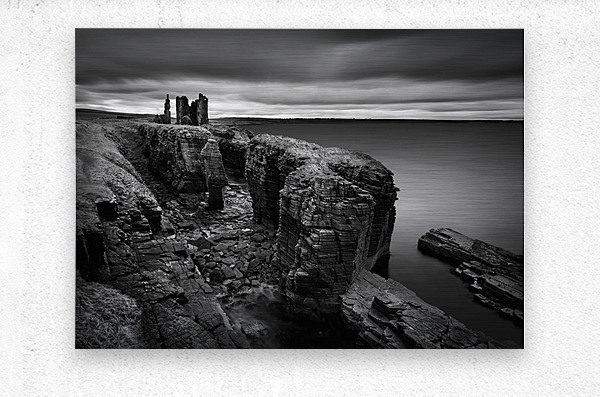 A monochrome, long exposure photograph capturing the historic Castle Sinclair Girnigoe, an ancient ruin standing prominently on the cliffs above the rugged coastline of Caithness, Scotland. The dark and foreboding sky adds a sense of mystery and drama, emphasizing the timeless presence of the castle against the wild coastal backdrop. A great photograph for history enthusiasts or anyone drawn to atmospheric and dramatic landscapes.