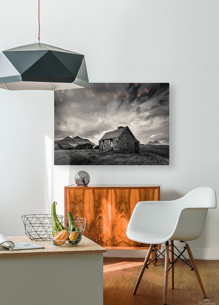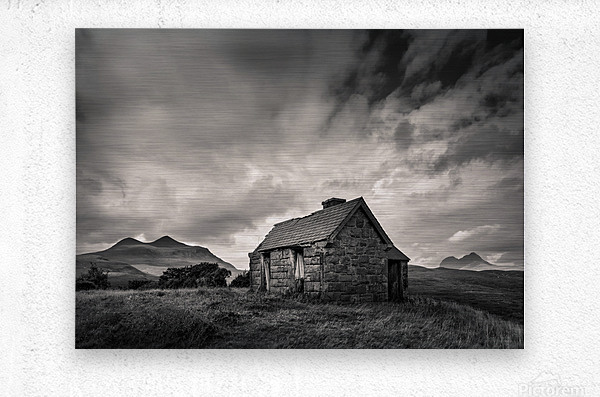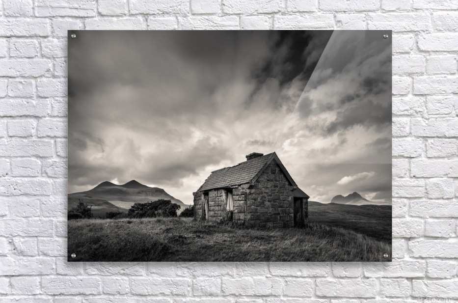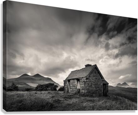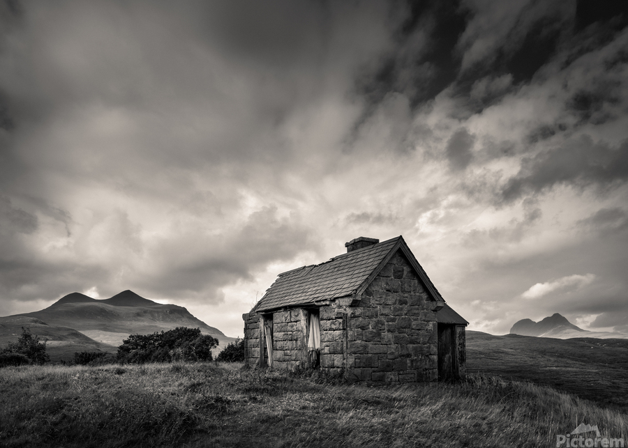 An abandoned Highland bothy stands alone in the rugged landscape of Sutherland, Scotland, with the distant silhouettes of Cul Mor and Suilven rising against the horizon. Overhead, dramatic clouds add a sense of atmosphere and isolation. A great photograph for those who appreciate the untamed beauty of Scotland’s wilderness.