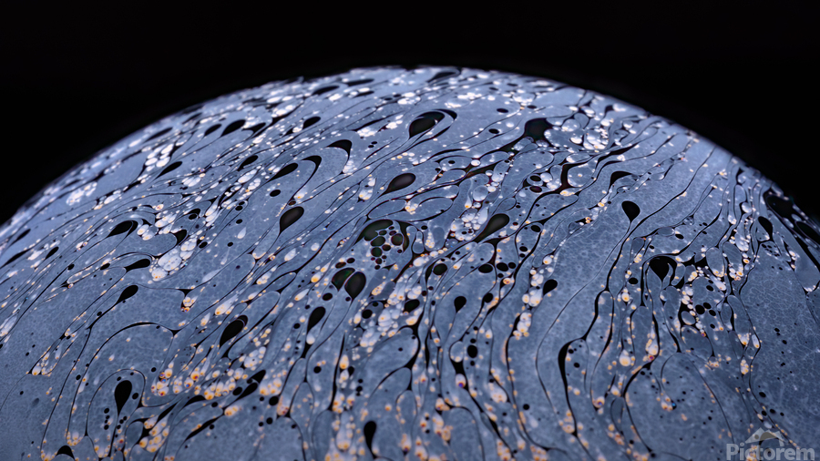 A macro photograph of light reflecting off the surface of a simple soap bubble as the surface tension begins to break down just before it pops. One in...[+]