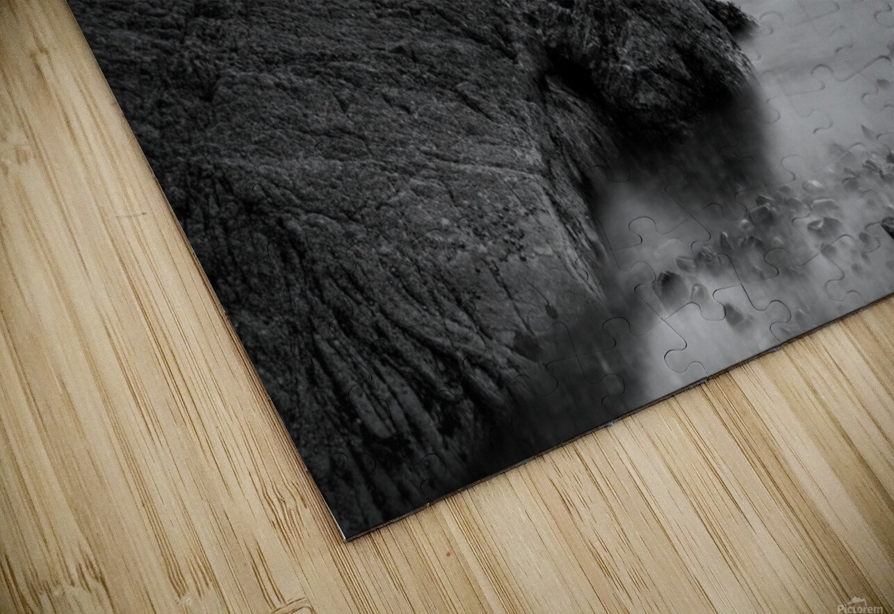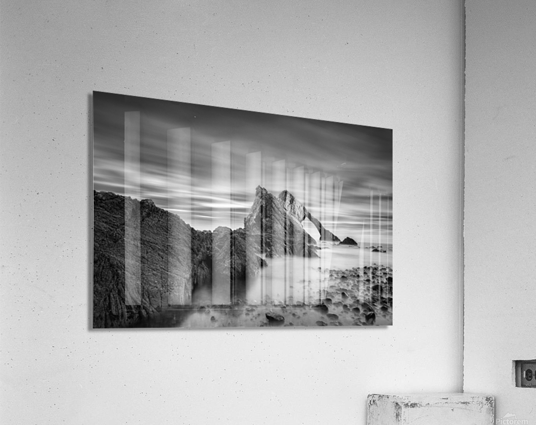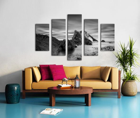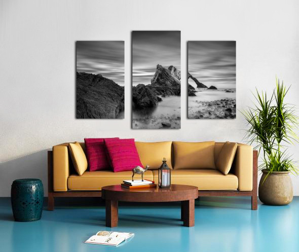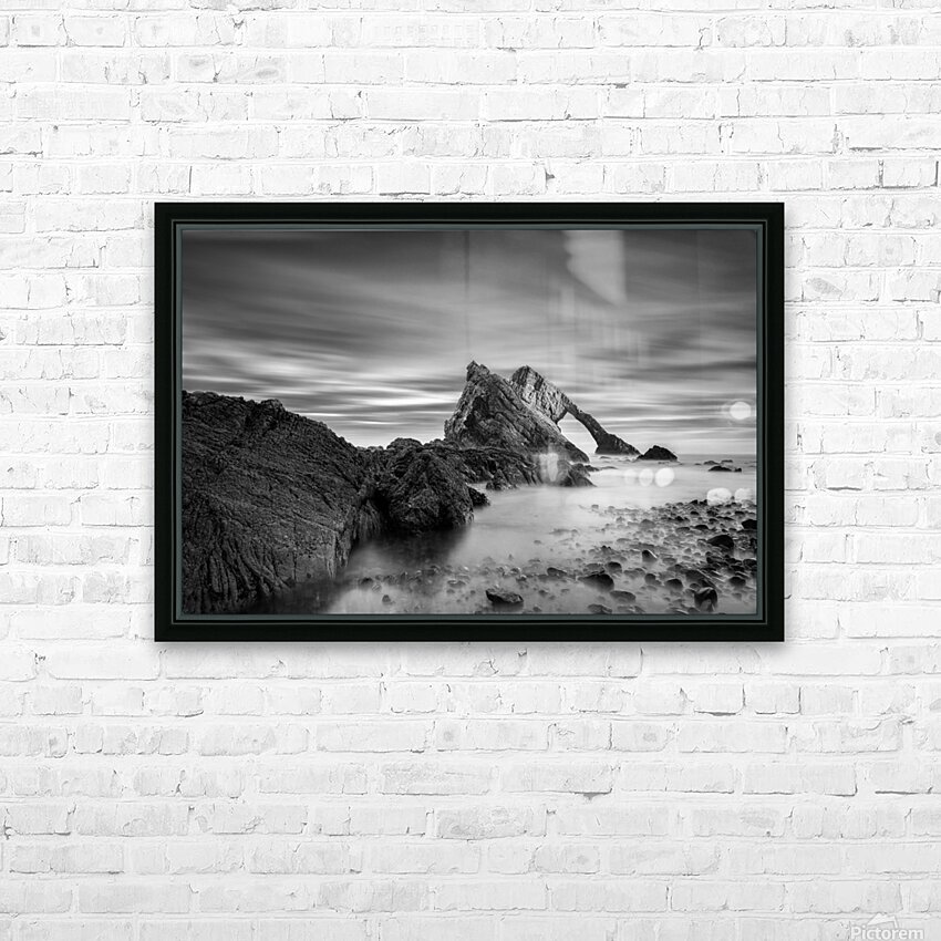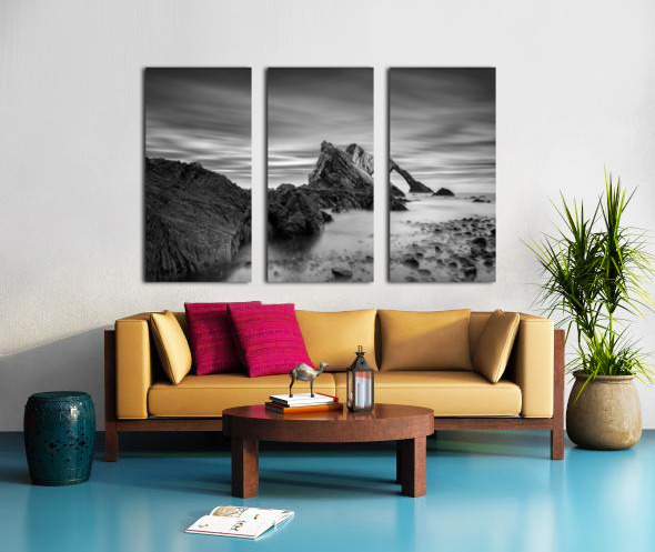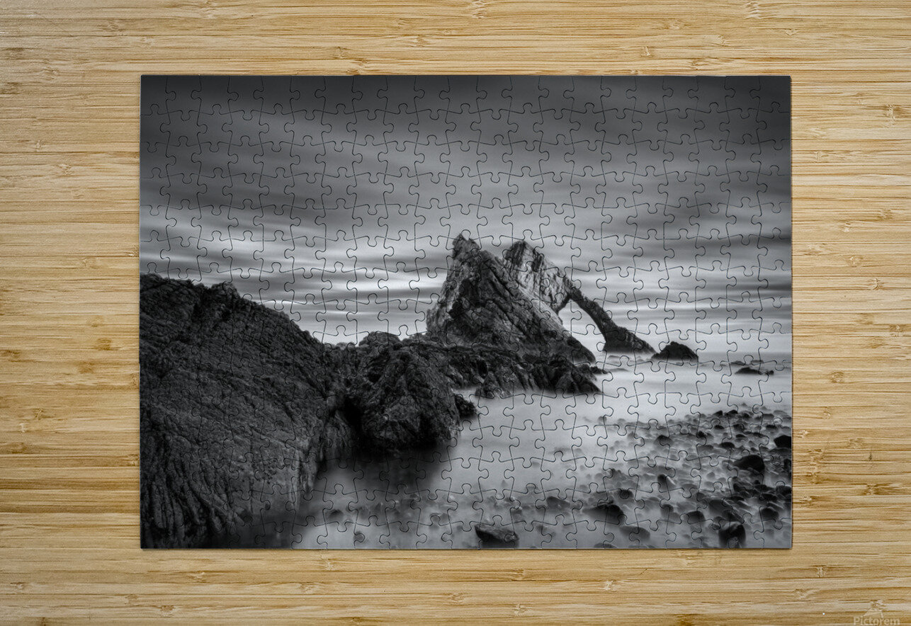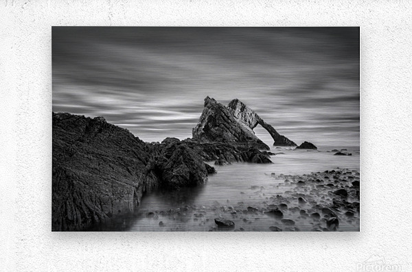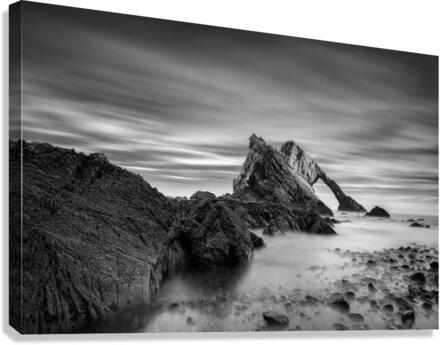 A black and white, long exposure view of Bow Fiddle Rock at Portknockie, Aberdeenshire, Scotland. The natural sea arch rises from the North Sea, its quartzite form standing prominently against the water. The long exposure smooths the surrounding sea, creating a calm, almost ethereal atmosphere around the distinctive arch. Bow Fiddle Rock is a well-known landmark on Scotland’s north-eastern coast, shaped over centuries by the relentless erosion of the sea. Its arch resembles the tip of a violin bow, giving the rock its name, while the surrounding cliffs and coastline showcase the rugged beauty of the region. A perfect image for anyone who enjoys coastal landscapes, dramatic natural formations, or the quiet beauty of Scotland’s shoreline. This image is available as wall art and across a wide range of formats to suit your space or style.