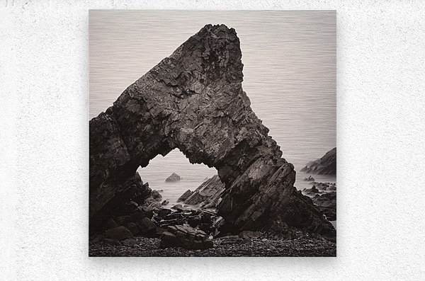 Looking through Needle's Eye rock on a foggy day, Tarlair/Macduff, Scotland, UK. ..... Please note: This image has a slight grainy texture which is intentional.