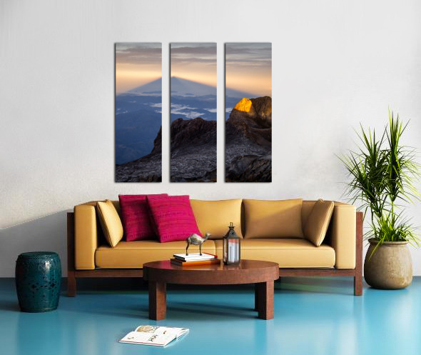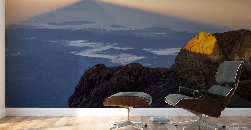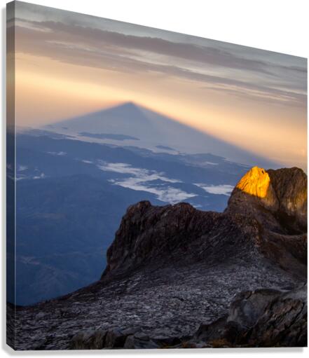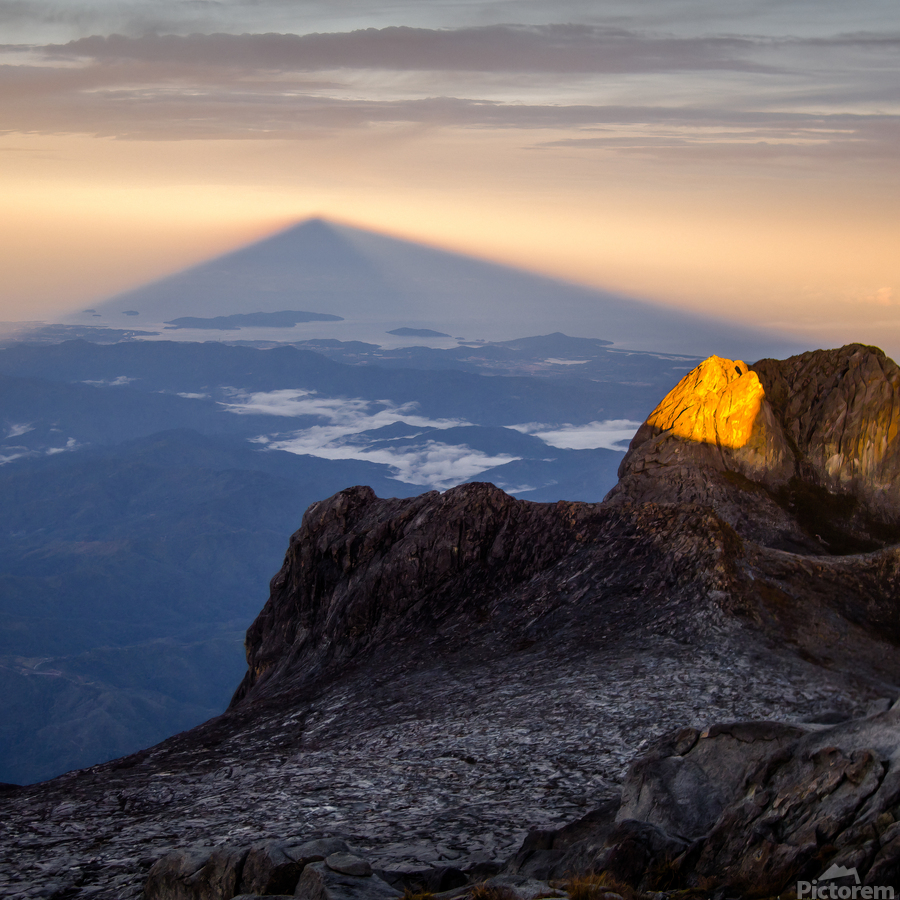 Sunrays cast a triangular mountain shadow from the top of Mount Kinabalu at sunrise, Sabah, Malaysia.