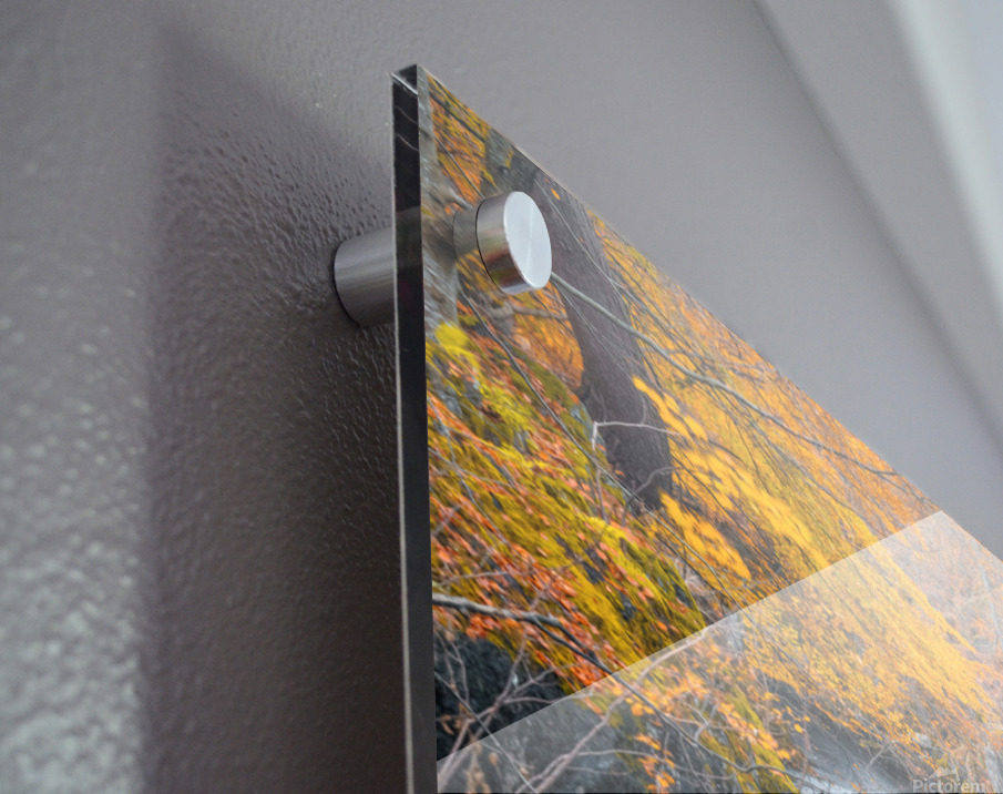 A captivating photograph of autumn colours along the River North Esk in Angus, Scotland. The river flows through a scenic creek, surrounded by rocks and vibrant trees. A long exposure technique captures the fluid movement of the water, creating a serene and dynamic scene. Perfect for nature lovers, home decor, or office spaces looking to bring the beauty of autumn indoors.