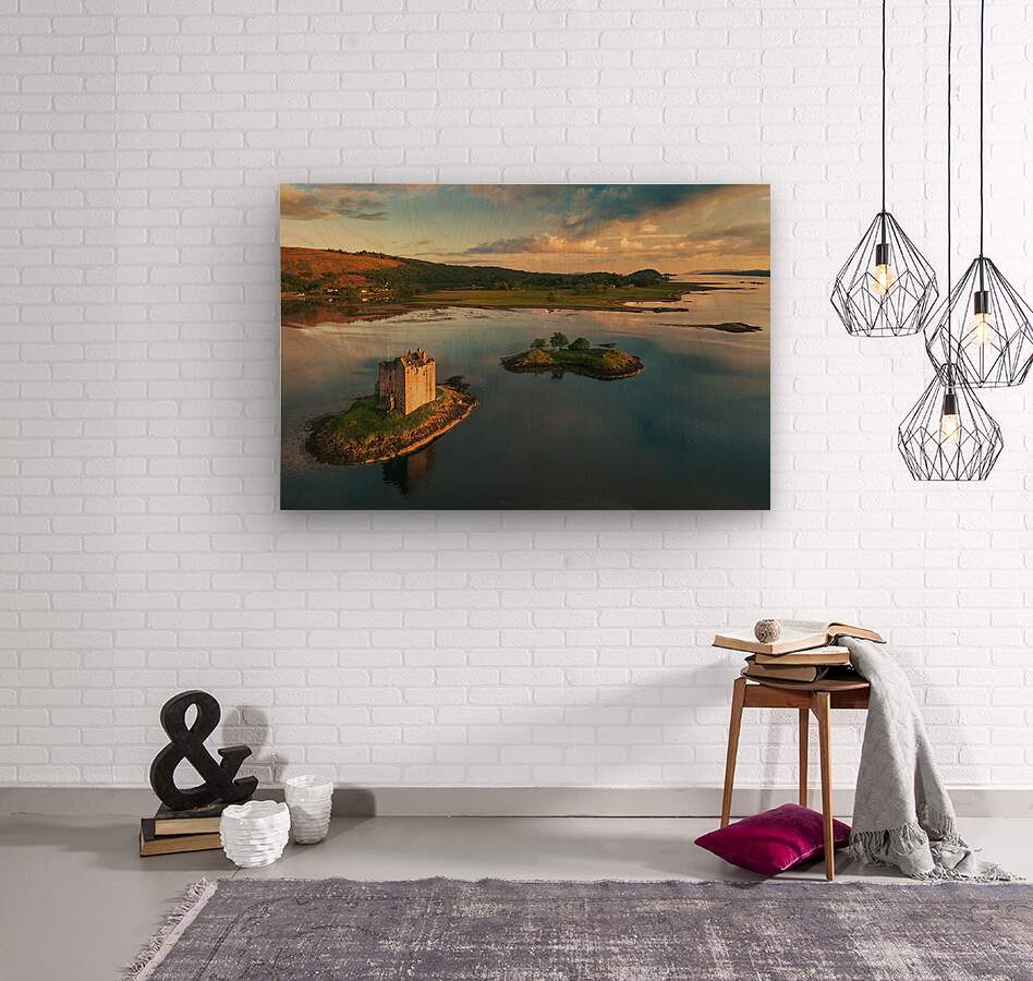 Stunning aerial view of Castle Stalker at sunset located on Loch Laich in the Scottish Highlands Scotland. This breathtaking photograph captures the iconic castle surrounded by the tranquil waters of the loch with the vibrant colors of the setting sun illuminating the beautiful scenery. Ideal for anyone seeking images of Scottish landmarks serene landscapes and historic sites in Scotland.
