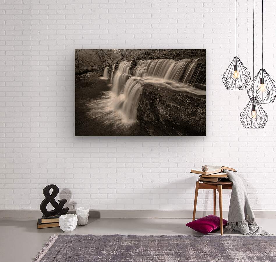 A warm-toned monochrome, long exposure photograph captures the serene beauty of Sgwd Yr Pannwr waterfall as it gracefully tumbles over a rugged rocky ledge into a tranquil stream below. Also referred to as Fall of the Fuller, this picturesque cascade is nestled along the Afon Mellte river in the breathtaking landscape of the Brecon Beacons, South Wales.