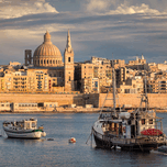 The serene waterfront of the old town of Valletta in Malta with two boats in the foreground and the city bathed in the last of the days sunlight. In the background is the famous domed roof of the Basilica of Our Lady of Mount Carmel.