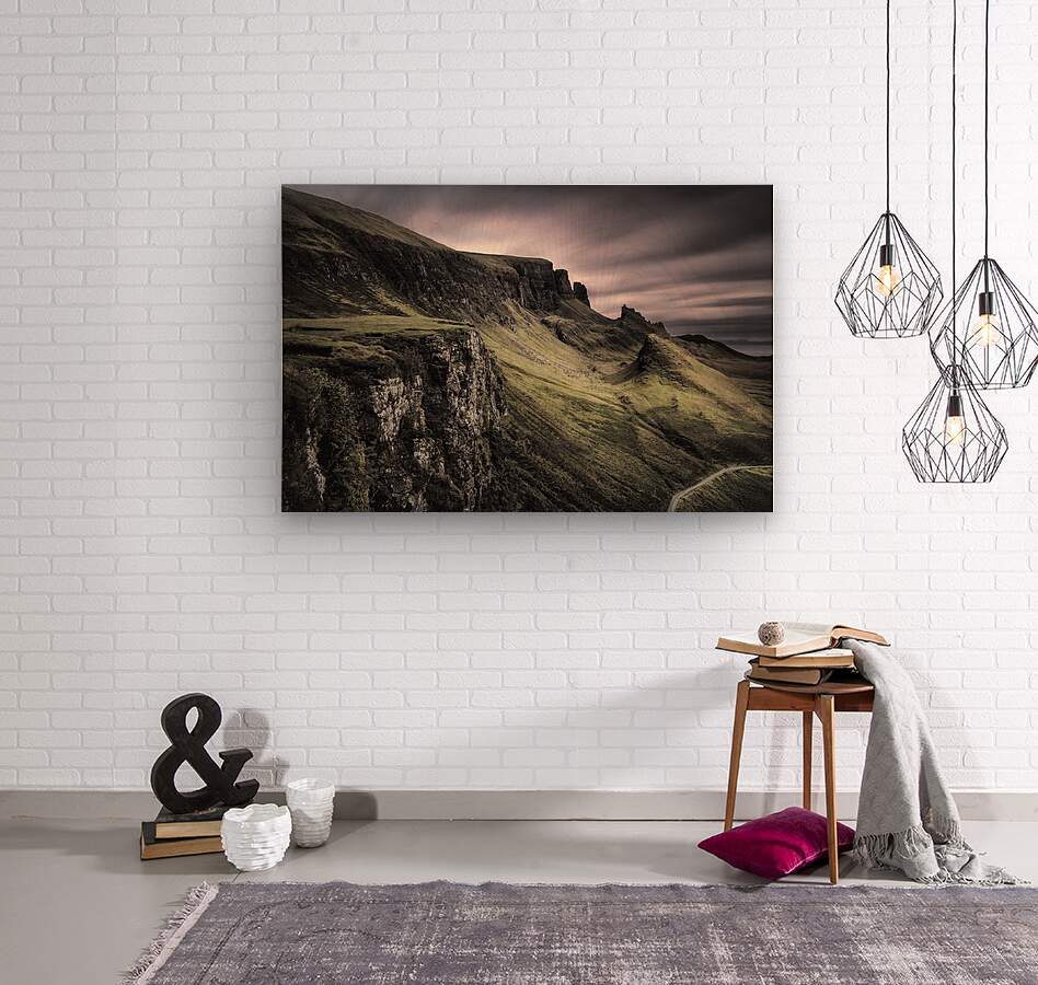A moody long exposure view of the Quiraing on the Isle of Skye Inner Hebrides Scotland. This atmospheric photograph captures the dramatic landscape of the Quiraing with its rugged terrain and eerie cliffs. The long exposure technique enhances the brooding sky and smooths the movement of clouds creating a surreal and captivating scene. Ideal for those seeking a photographic representation of Scotlands wild and mysterious beauty this image showcases the unique geological formations and haunting ambiance of the Quiraing.